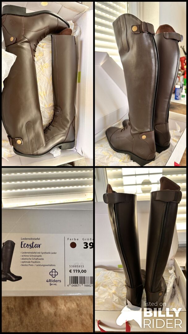 Die Reitstiefel von der Marke 4Riders, Modell Ecostar ist komplett neu. Der Stiefel wurde nicht ein Mal getragen, somit auch nicht genutzt. Dadurch gibt es keinerlei Gebrauchsspuren. Der Stiefel ist in der Farbe braun und sieht sehr edel aus. Der Neupreis des Stiefels lag bei 119,00€.