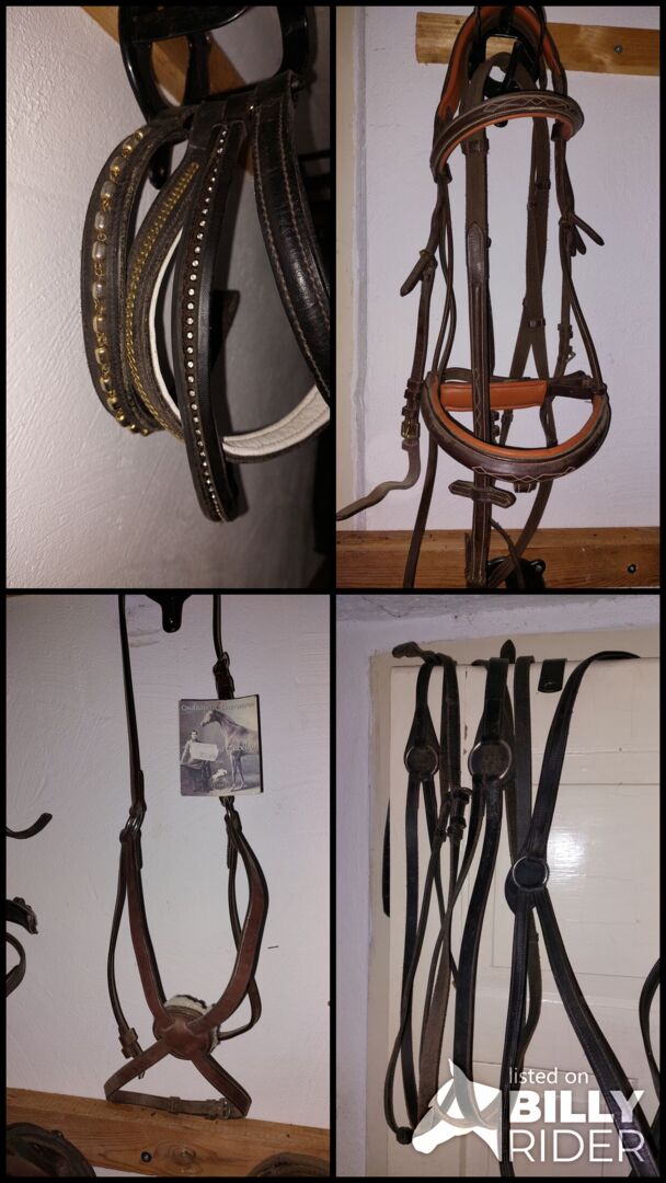 Biete zwei Kartons voll mit verschiedenen Trensen , dreieckszügeln , Vorderzeugen, Zügeln, mehere Martingale ,