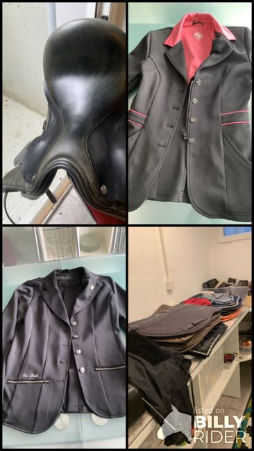 1 Dressursattel, versch. Zaumzeuge, über 2 Schabracken mit Ohrengarn, Fliegengarn, Bandagen, 2 paar Stiefel40 gr. 2 Decken, usw. 1 Helm, 6 paar Showmaster COB, Handschuhe 2 par warme M und 1 paar braun M, 1 par weiss L, 1 paar schwarz s, 2 paar schwerz M, Reitkleider für Dressur, 2Decken blau, Gamaschen 2 Paar M, 1 Paar S, verschiedene Peitschen, möchte gerne alles zusammen verkaufen