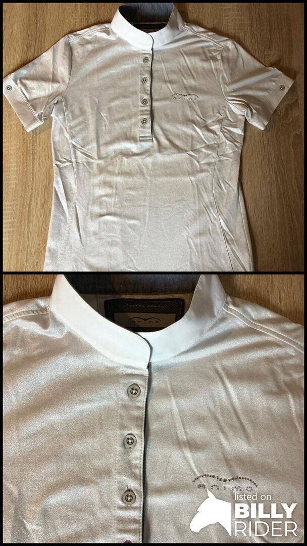 Verkaufe diese schicke Turnierbluse der Marke Animo in weiß glänzend. Das Shirt wurde nur ein Mal auf dem Turnier getragen und ist daher in einem neuwertigen Zustand.