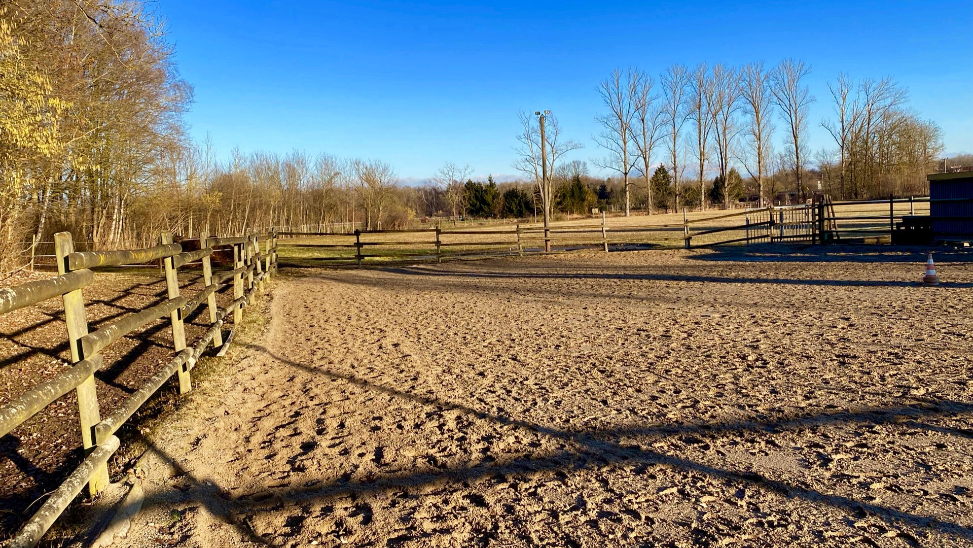 Wir haben einen beleuchteten Sandreitplatz, der Longierzirkel ist in Arbeit und ein schönes Ausreitgelände .