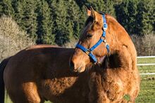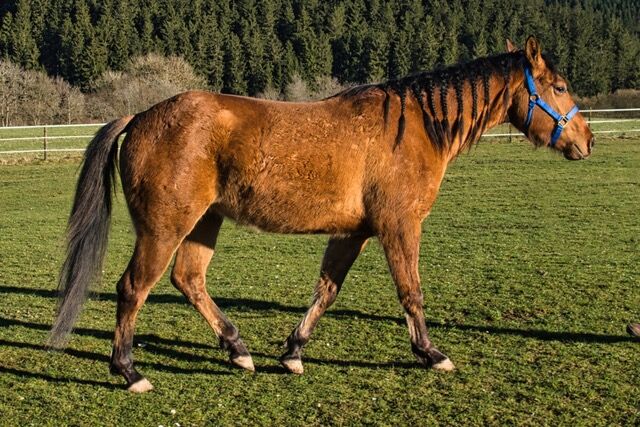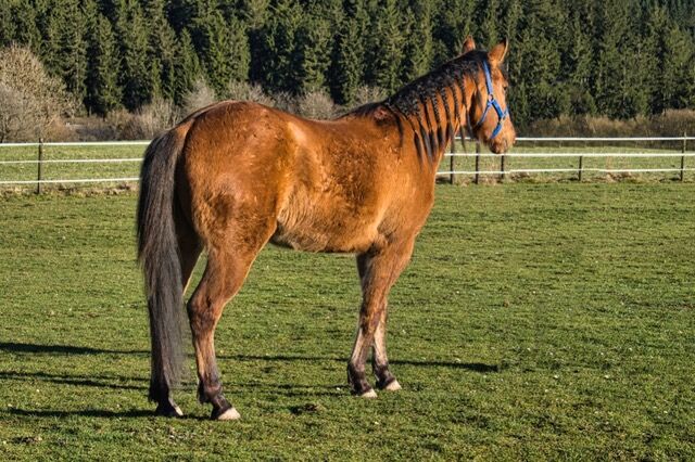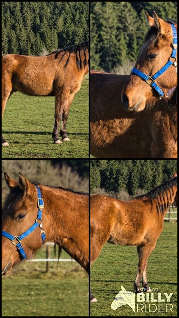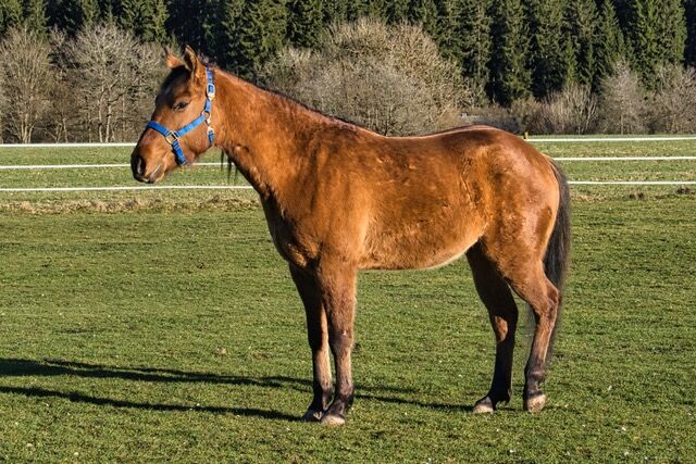 QB Riley Chex ist ein bildhübscher Quarter Horse Wallach, geboren am 13. April 2023, in der selten schönen Farbe Dun. Mit einem Foundation-Anteil von 92 % vereint er eine hervorragende Abstammung mit einem sehr korrekten, stabilen und harmonisch ausbalancierten Gebäude. Aktuell misst er etwa 150 cm Stockmaß und befindet sich noch im Wachstum. Schon jetzt überzeugt er durch seine elegante Erscheinung, seine tollen Bewegungen und seine natürliche Ausstrahlung. Riley wächst artgerecht in einer Jungpferdeherde im Offenstall auf und erhält eine hochwertige Versorgung mit Mineral- und Kraftfutter. Er ist gesund, altersgerecht entwickelt und wurde regelmäßig entwurmt. Tierarzt und Hufschmied kennt er bereits und meistert diese Termine ruhig und gelassen. Genetisch ist er 5-Panel n/n getestet und trägt GBED n/p. Besonders hervorzuheben ist sein außergewöhnlich lieber Charakter. Riley ist sehr menschenbezogen, freundlich und zutraulich. Er genießt den Kontakt zum Menschen, zeigt sich verschmust und neugierig und wird täglich gehändelt. Dabei präsentiert er sich aufmerksam, lernwillig und angenehm im Umgang. Er ist halfterführig und kennt bereits erste Bodenarbeit. Mit seinen schönen Bewegungen, seiner guten Foundation-Abstammung (Blackburn Buck Poco x Dun It Golden Chex) und seinem ausgeglichenen Wesen bringt Riley beste Voraussetzungen für eine vielseitige Zukunft mit. Ob im Sport, auf Turnieren oder als zuverlässiger Freizeitpartner - er bietet alle Möglichkeiten für jemanden, der ein junges Pferd mit Geduld, Fairness und Freude ausbilden möchte und einen echten Allrounder sucht. Abgegeben wird QB Riley Chex mit AQHA- und NFQHA-Papieren sowie Equidenpass. Zudem ist er bereits in das EWU-Jungpferdeprogramm eingezahlt. Seine Aufzucht erfolgte liebevoll und verantwortungsvoll direkt beim Züchter. Ein wundervolles Jungpferd mit viel Qualität, Ausstrahlung und Charakter, das seinem zukünftigen Menschen viele Jahre Freude bereiten wird.