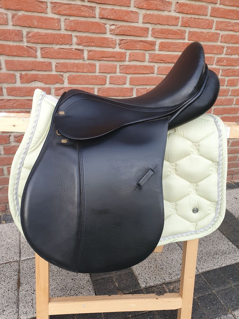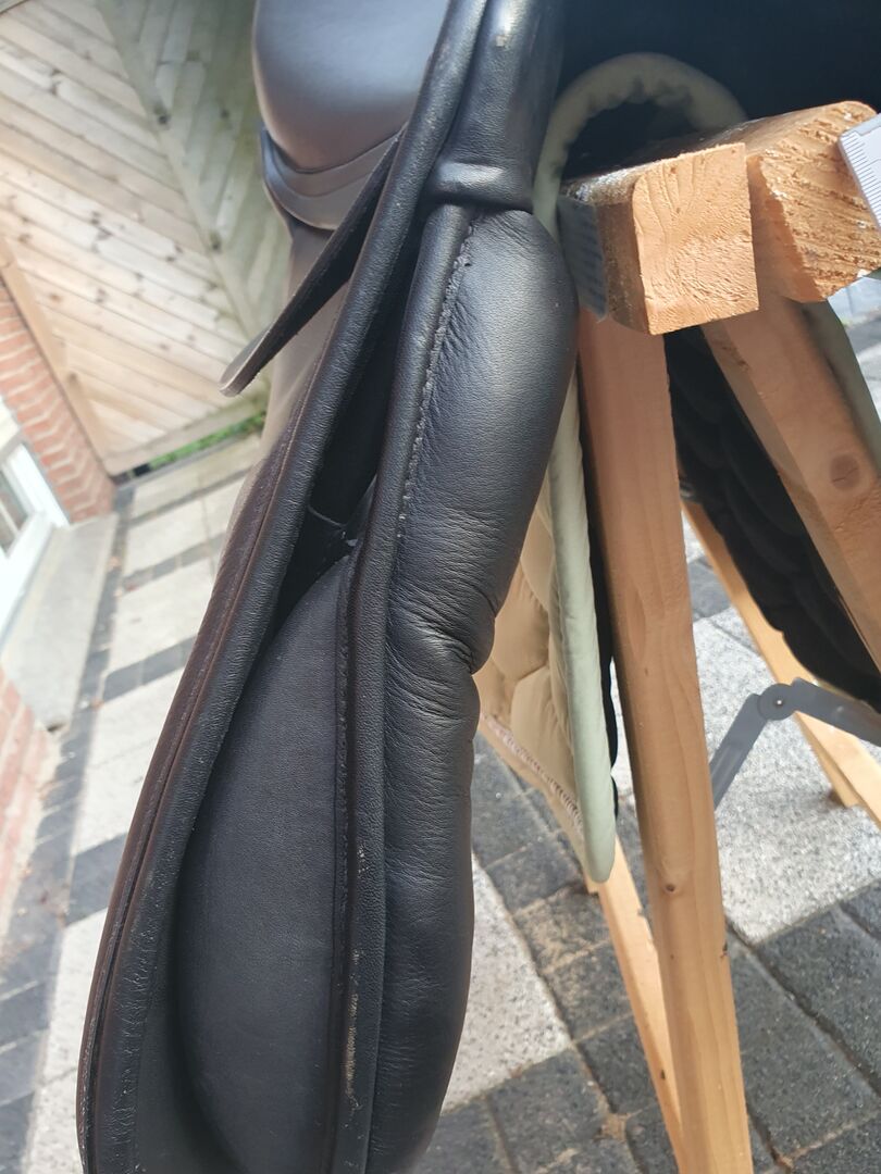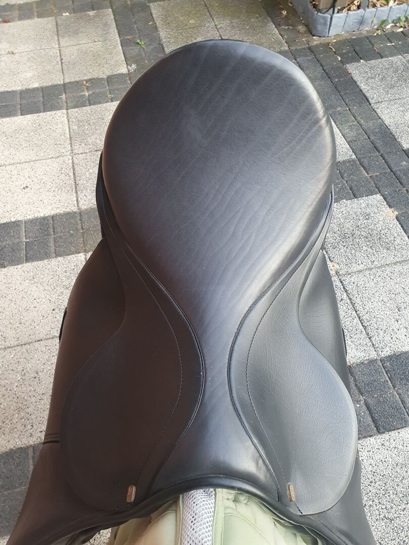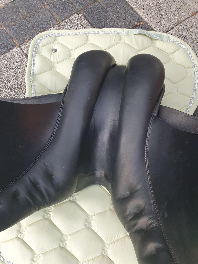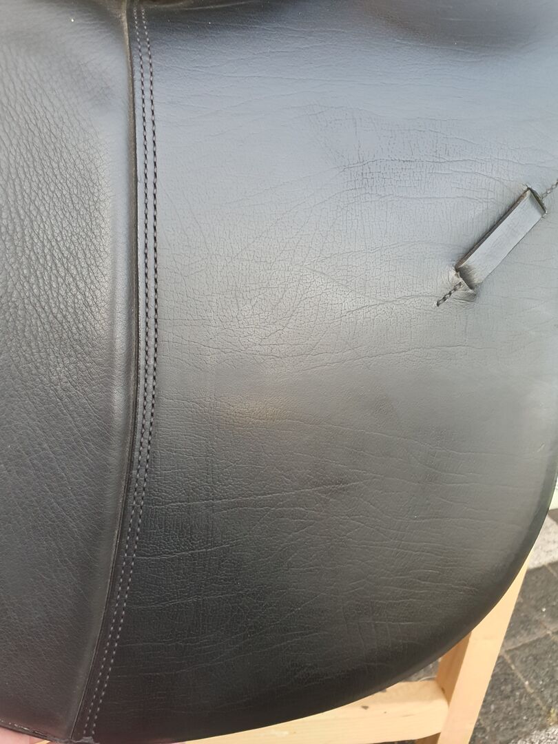 Der Sattel hat eine schön gleichmäßige Polsterung, kaum Gebrauchsspuren an Strippen und Sattelblättern Eine Größenangabe finde ich nicht. Vom Sattelnagel bis Mitte Efterkante sind es 43 cm, was in etwa 17 Zoll entspricht. Die Kammer ist auf Höhe der Sattelnägel ca 13,5 cm breit. Das Leder hat eine genarbte Struktur.