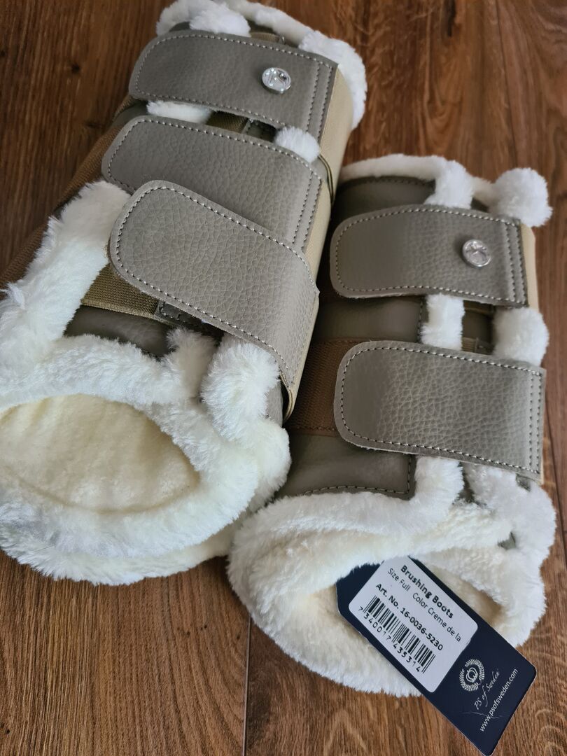 Gamaschen haben eine genarbte, vegane Lederoberfläche, ein extra Patch an der Innenseite und sind mit weißem Kunstfell unterlegt.