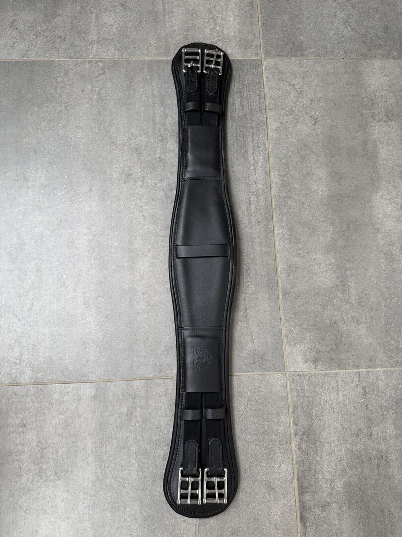 Dressurgurt - Schwarzer Ledersattelgurt mit Gummibändern und Edelstahlschnallen. Als Geschenk erhalten, aber nie benutzt, weil ich keine Gummibänder im Sattelgurt mag.