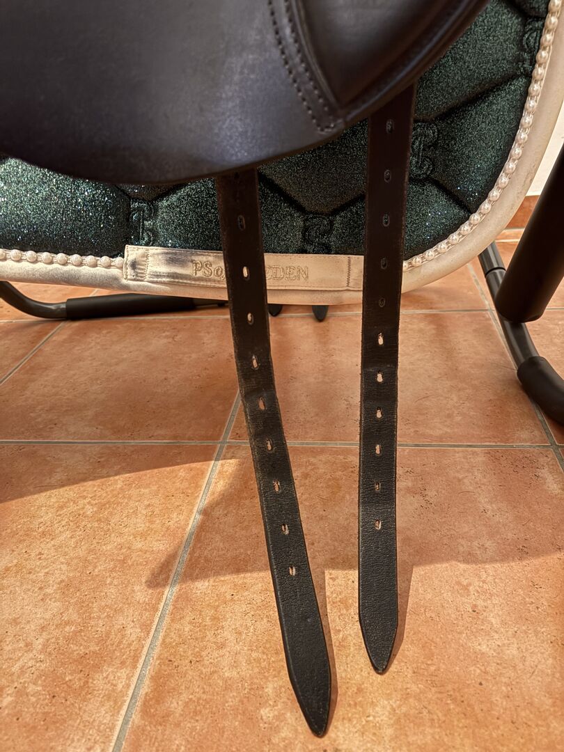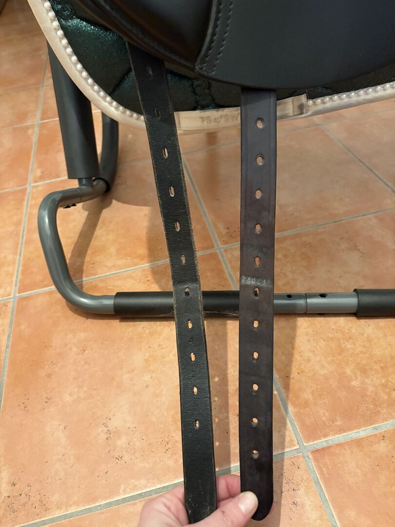 Auf der linken Seite wurde nach einer Stunteinlage meines Pferdes die hintere Gurtstruppe auf meinen Wunsch hin von der Sattlerin erneuert.