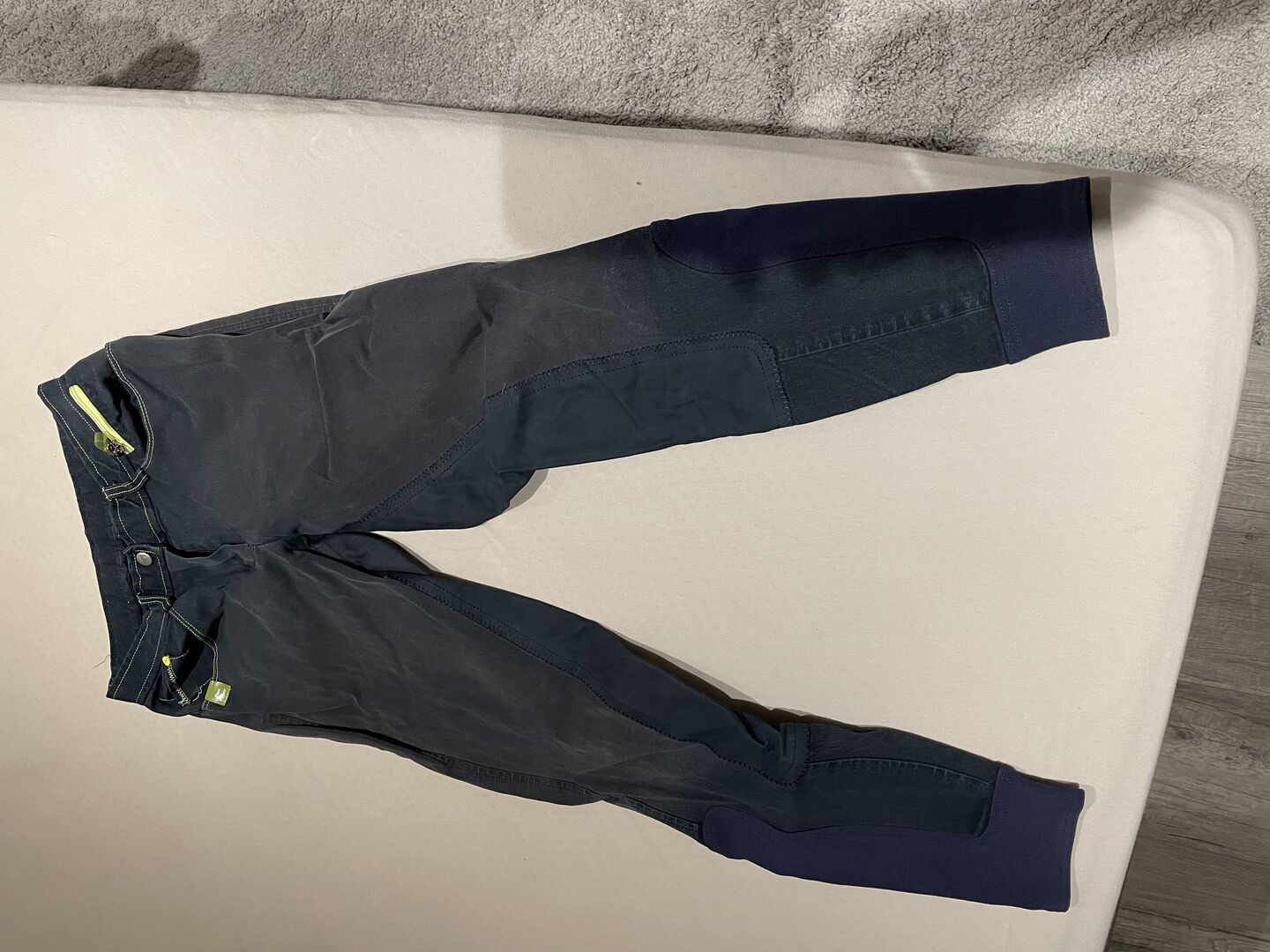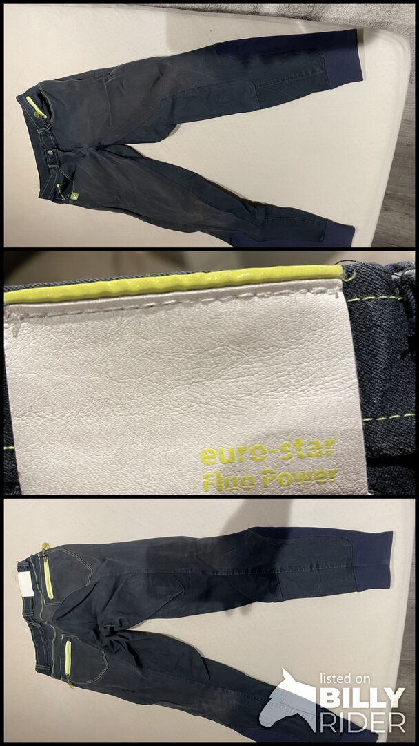 Gut erhaltene dunkelblaue Eurostar Vollbesatz Reithose mit neon grün/gelben Nähten, Größe 36, elastischer Beinabschluss