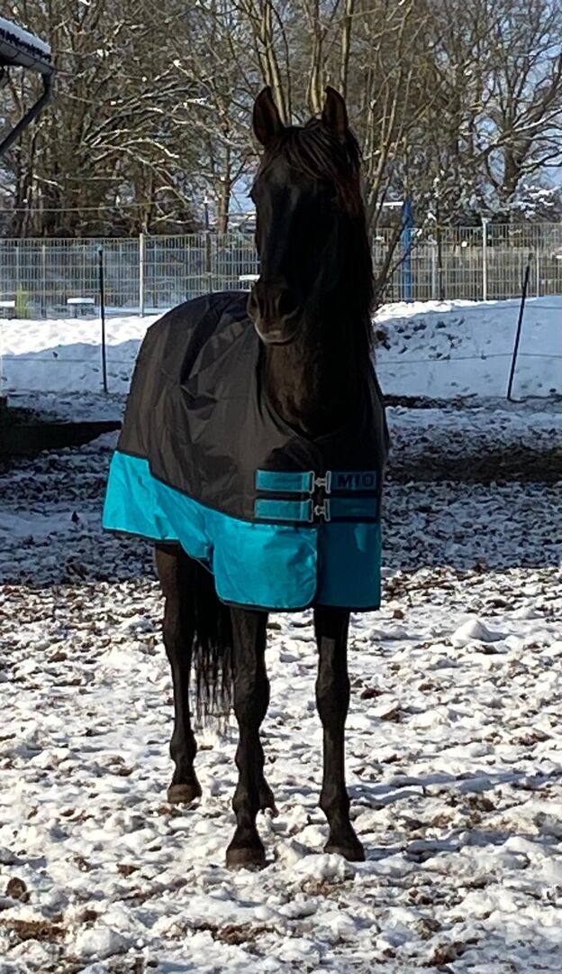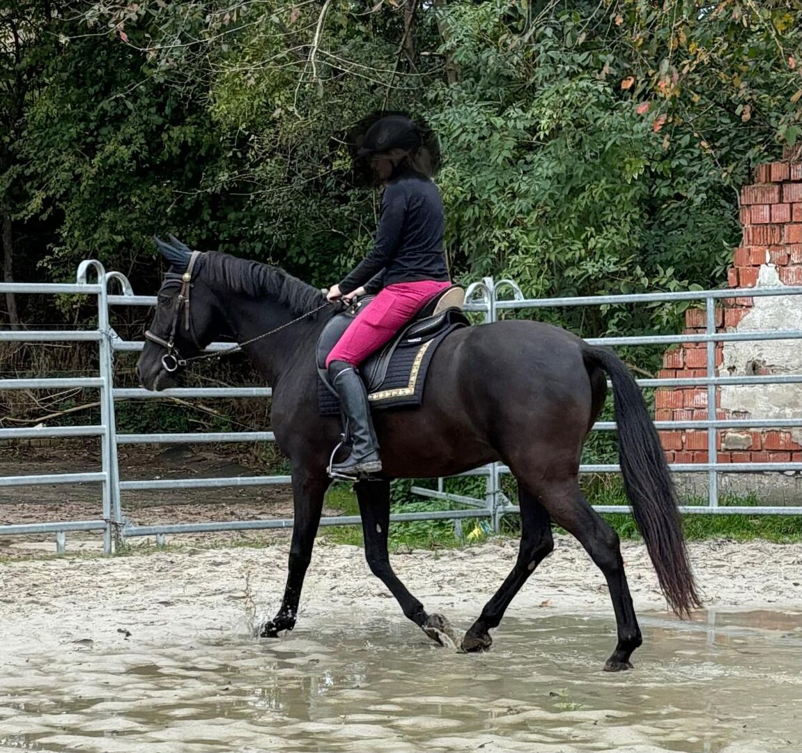 Negrito- feinfühliger und sehr sozialen Andalusier-Wallach, 2017 geboren und mit einem Stockmaß von 158 cm. Er ist ein bildhübsches, schwarzes Pferd mit einem sensiblen Wesen. Negrito besitzt einen menschenbezogenen, neugierigen und feinfühligen Charakter. Er ist kein Pferd für Grobmotoriker, sondern braucht Einfühlungsvermögen und eine ruhige Hand. Er lernt sehr schnell und reagiert äußerst fein auf Hilfen. Spanier-typisch hat er viel Go, ist aber jederzeit regulierbar und zeigt keine Unarten wie Bocken, Steigen oder Durchgehen. Unter dem Sattel benötigt Negrito einen ruhigen Sitz und eine ruhige Hand, weshalb er eher für erfahrene Reiter geeignet ist, die sich mit Spaniern auskennen. Er hat eine gute Grundausbildung, läuft sicher in den Grundgangarten und mit den Seitengängen wurde bereits begonnen. Seine Ausbildung wird von einem Profi begleitet, um ihn bestmöglich zu fördern. Er geht sowohl alleine als auch in der Gruppe ins Gelände, wobei er alleine noch etwas unsicher ist. Da er eher feingliedrig gebaut ist, ist er kein Gewichtsträger (70-80 kg). Aktuell steht Negrito in einem Offenstall in einer gemischten Herde, ist dort rangniedrig, sehr sozial und spielt gerne mit Artgenossen. Optional kann ein anpassbarer Schleese-Sattel zum Sonderpreis erworben werden, was den Einstieg für den neuen Besitzer erleichtert. Wenn du einen sensiblen, lernfreudigen Andalusier suchst, der mit viel Herz und Charakter überzeugt, könnte Negrito genau das Richtige für dich sein!
