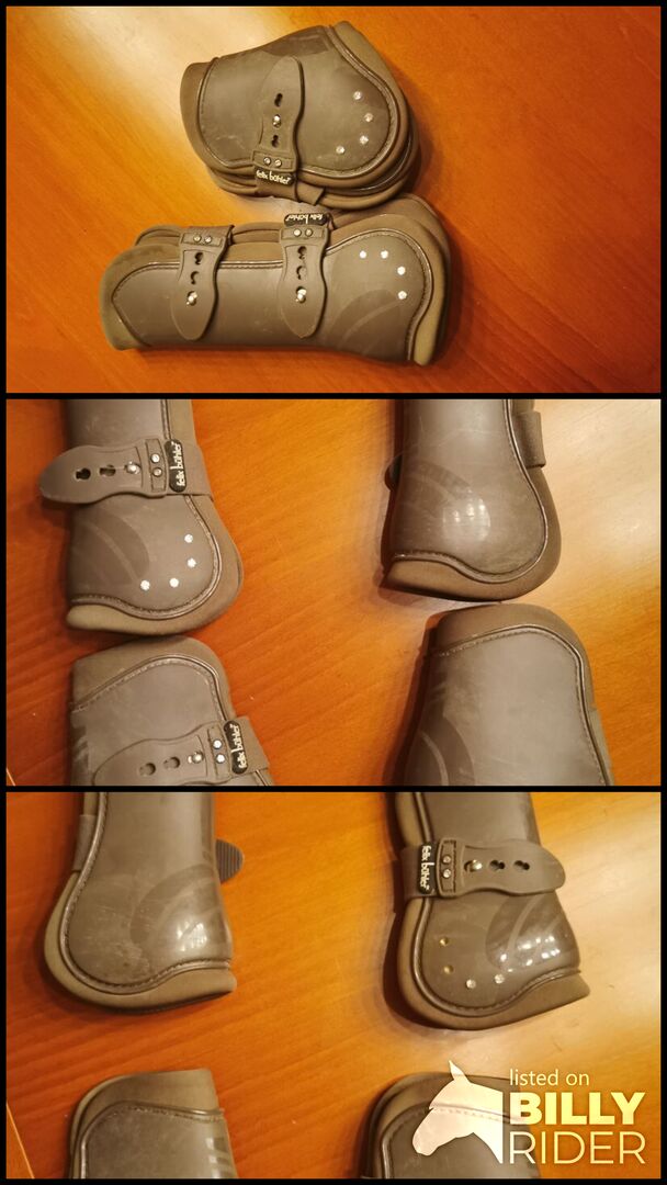 Softzone Hartschalgamaschen und passende Streichkappen mit anatomischer Form und schlagfester Außenschale geben dem Pferdebein über dem Sprung optimale Bewegungsfreiheit. Ein echter hingucker sind die Glitzersteine auf der Außenseite der Gamasche und Streichkappe. Das Innenfutter ist aus weichem Chloropren- Kautschuk und Schnellverschluss- System. Wenige benutzt an der Schale ein wenig Kratzer und bis auf zwei Glitzersteinchen sind auch noch alle vorhanden.