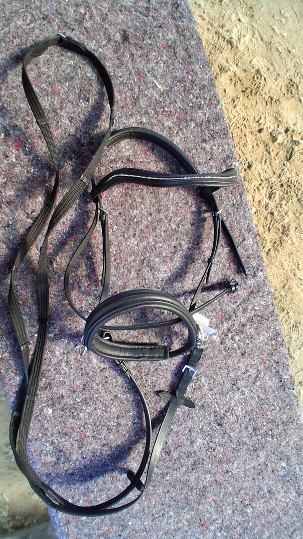 Kaufe hier mein Gebisslosen Zaum mit Zügel.