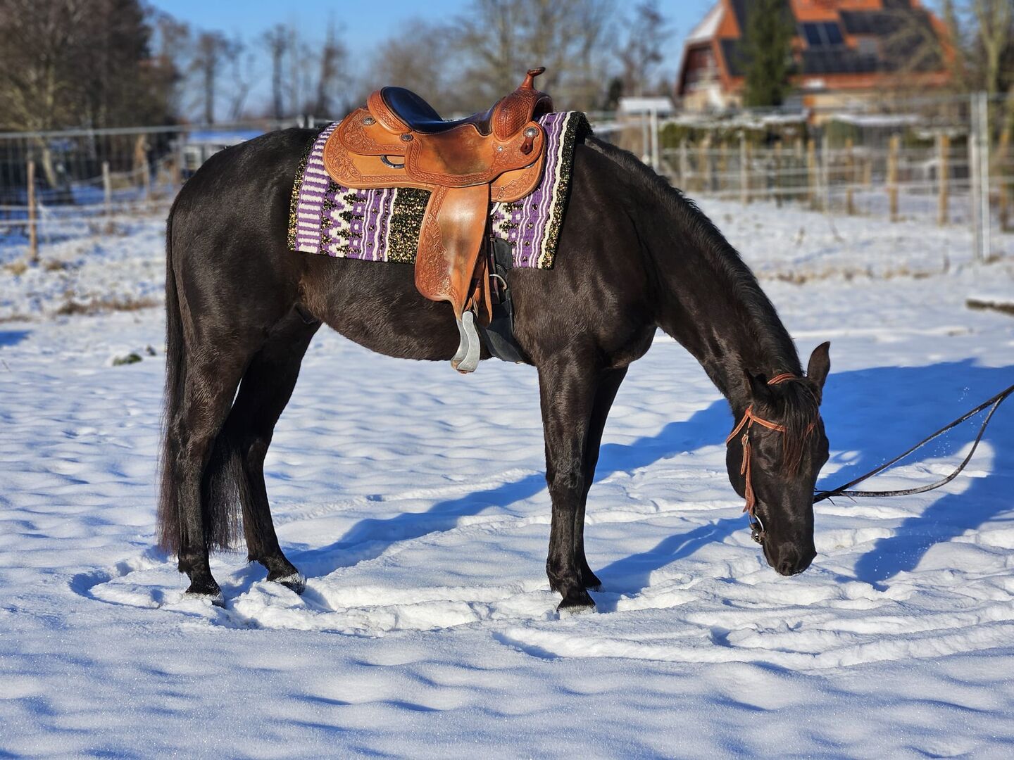 Zum Verkauf steht Voodoo, ein vierjähriger Quarter Horse Wallach. Er hat die Farbe schlechthin: Black. Und das ganz ohne Abzeichen. Voodoo ist ein rahmiges Pferd mit harmonischem Body. Auch durch seine lange Mähne ist er ein richtiger Hingucker. Er hat ein Stockmaß von 155 cm und kann damit auch problemlos größere und/oder schwerere Reiter abdecken. Mit seinen langen und geraden Beinen entspricht er dem modernen Allround-Sportpferde-Typ. Der Rappe ist ein direkter Shiners Voodoo Dr. ( 3 Million Dollar Sire) Sohn aus einer Topsail Whiz gezogenen Stute. Also ein Pedigree vom Feinsten. Seine Grundausbildung hat Voodoo im Profiberitt genossen. Er ist unverbraucht, wurde spät und schonend gestartet, hatte genug Zeit sich zu entwickeln und zu wachsen. Dabei sind beim Reiten alle Grundgangarten solide geritten und die Manöver leicht gestartet. Er ist unkompliziert zu reiten, zeigt stets sehr schöne Bewegungen unterm Sattel und ist auch bequem zu sitzen. Bei der Arbeit ist Voodoo leistungsbereit und eher sensibel. Er reagiert zu jeder Zeit aufmerksam und fein auf die Hilfen, ohne dabei jedoch hektisch zu werden.