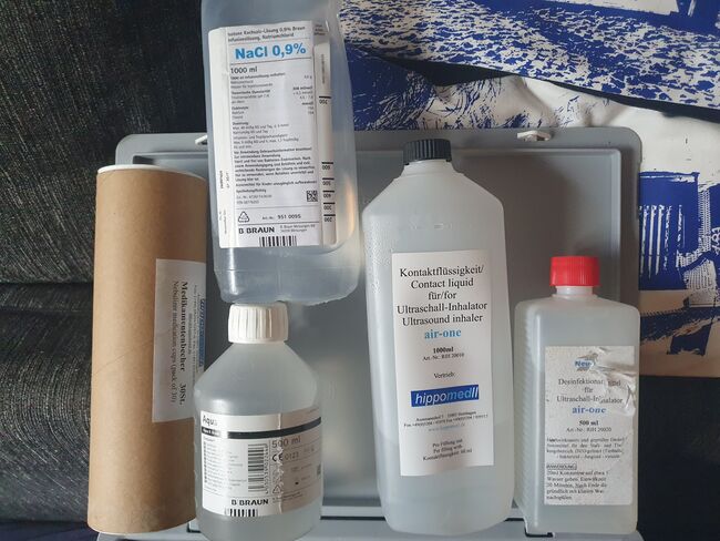 Der Inhalator kommt mit 13 Bechern, 1/3 Kontaktflüssigkeit, 1 Flasche destilliertem Wasser, Desinfektionsmittel als Konzentrat, einer 1/3 Flasche NaCl und hochwertiger Nordseesohle von Horsesupport.