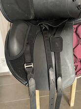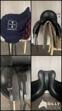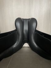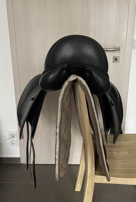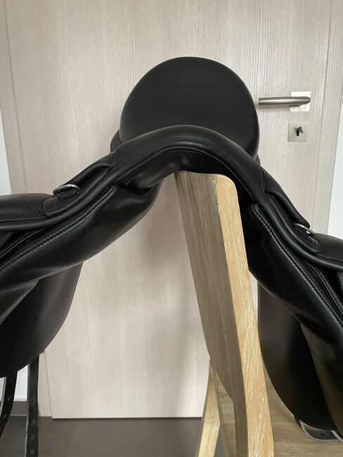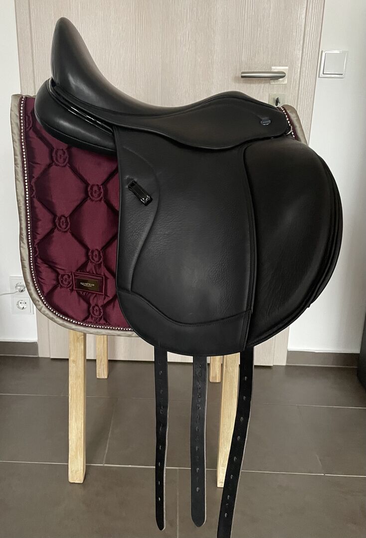 Dressursattel mit einer Sitzgröße von 17 Zoll. Durch das große Sattelblatt finden auch große Reiter gut Platz. Er ist weich gepolstert und mit schicken Lackdetails ausgestattet. Das Kopfeisen kann selbst gewechselt werden. Momentan in die Größe MW verbaut. Ein Kopfeisen in Größe M und der abgebildete Sattelschoner sind dabei.