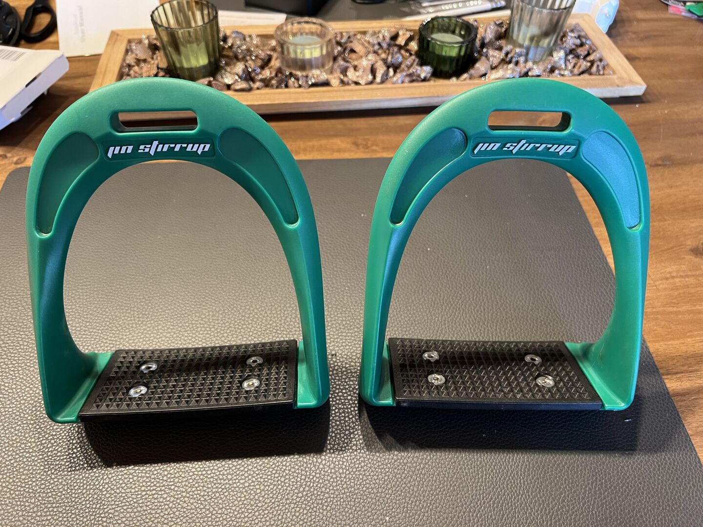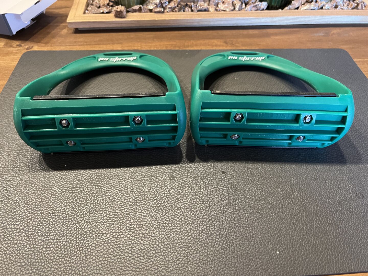 Steigbügel von Jin stirrup. Es handelt sich um das Modell Evol. Die Farbe ist ein schönes Gras Grün, das kommt nur leider auf den Fotos nicht so rüber.