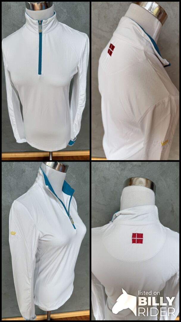 Weißes Longsleeve mit türkiesen Akzenten. Kragen, Armbündchen, Reißverschluss in einem kräftigen türkies. Sonnenschutz SPF 30, mesh Einsätze an den Armen, schnelltrochnendes Funktionsshirt Entspricht einer deutschen Gr. 36