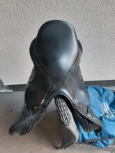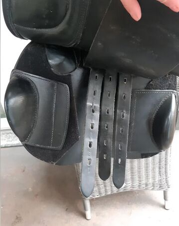 "Springsattel mit mitteltiefen Sitz und mittelhohen Pauschen, befestigt mit Klettverschluss. Französisches Wollkissen mit Keil ermöglicht eine gute Sattelanpassung. Dank der verstellbaren Knie- und Wadenpauschen ist eine individuelle Anpassung für jeden Reiter möglich."