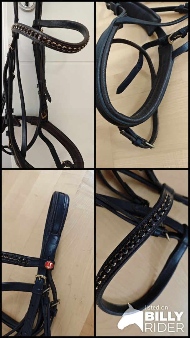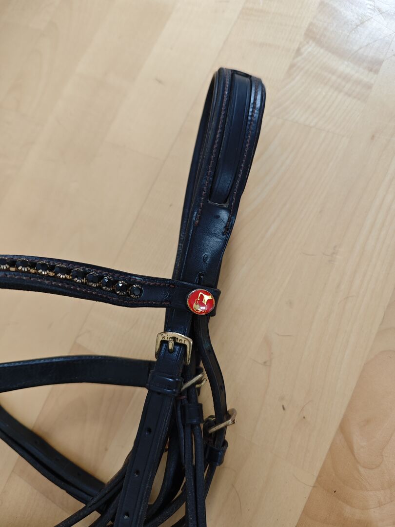 Die Trense hat schwarze Steinchen mit goldfarbenen Verzierungen am Stirnriemen. Das Leder ist in schwarz und braun.
