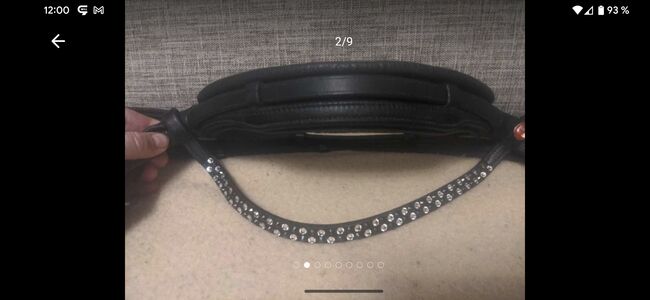 weich gepolstertes Genickstück mit Rückschnitt für gute Ohrenbeweglichkeit schwarz-silberne Steinchen am Stirnriemen alle vorhanden englisch kombiniertes Reithalfter, es fehlt jedoch der Sperrriemen Lack am Nasenriemen auf beiden Seiten schon etwas beschädigt (siehe Bilder), in der Mitte noch schön (siehe Bild) Verschnallung des Nasenriemens mit zusätzlichem Lederschutz (siehe Bild) ein Riemchen auf der rechten Seite beim Kehlriemen kaputt (siehe Bild)