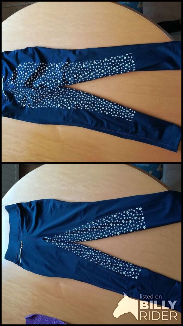 Kinder Sommer Reitleggins in sehr gutem Zustand, dunkelblau, Grip in weiß mit Blumenmuster.