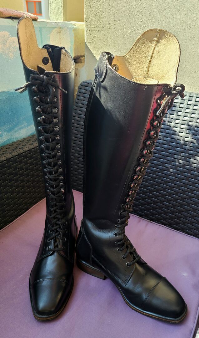 Wunderschöne neue Königs Reitstiefel. Sie wurden von meiner Tochter nur einmal zum anprobieren getragen, da sie noch ein zweites Paar bekommen hat. Sie sind also noch nicht eingelaufen. Größe 6 entspricht 39. Sie sind superchic und einfach zu schade um hier im Schrank zu stehen. Tolles Leder, mit Schnürung vorne, wenn die Wade noch zulegt. Königs Reitstiefel halten ewig und es reitet sich damit toll! Ich habe selber welche seit einer Ewigkeit. NP: 620 Euro
