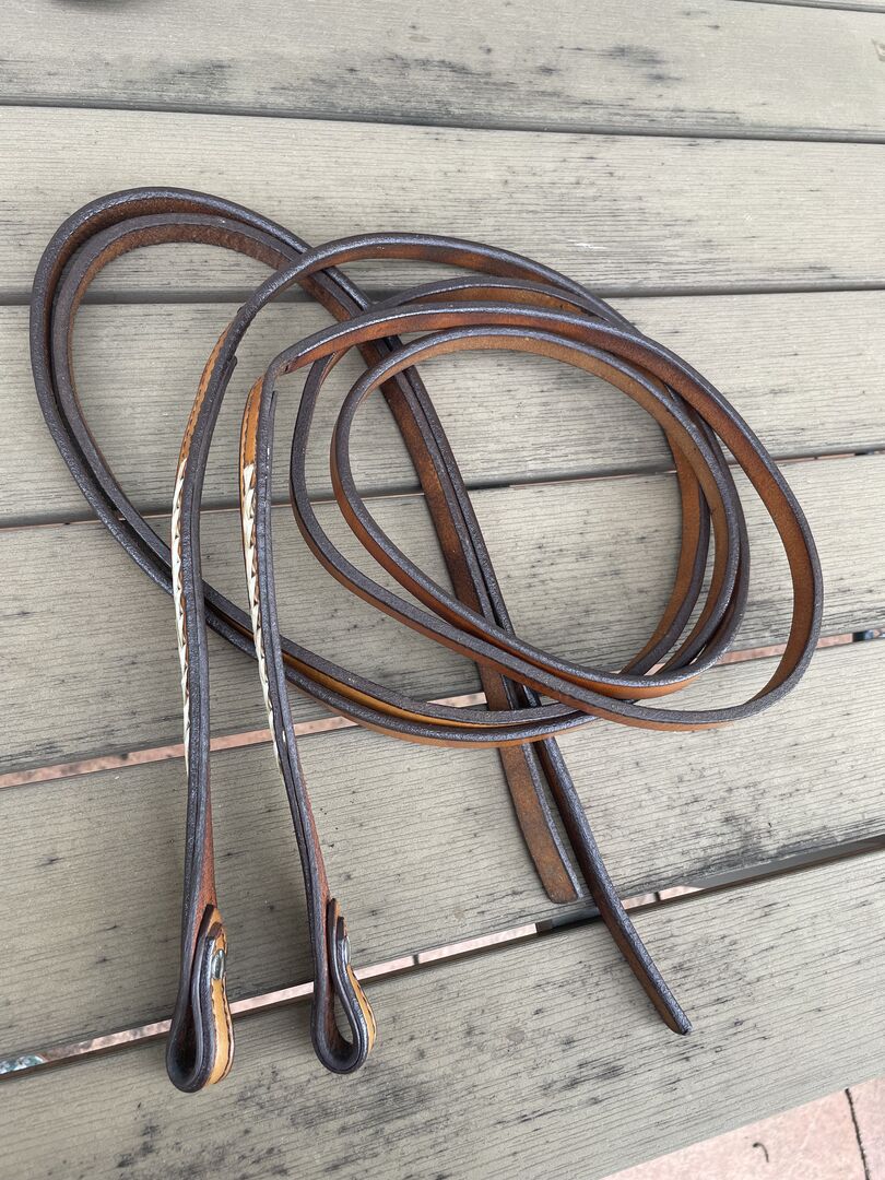 Unbenutztes Kopfstück aus hellem Leder mit Rohhaut einflechtungen. Incl. Zügel, ebenfalls mit Rohhaut.