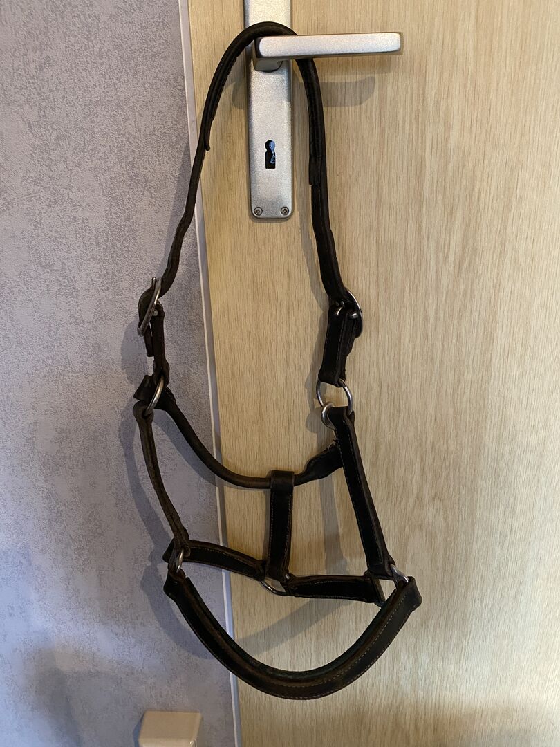 Lederhalfter. Es ist mit einem schönen grünton am nasenriemen unterlegt, sonst ist das Halfter schwarz. Das Halfter ist etwas älter, hat dementsprechend auch einige Gebrauchsspuren und könnte nochmal etwas Öl vertragen. Es wurde mir als WB und guten Zustand verkauft, aber das Leder war sehr Steif. Gereinigt und gefettet habe ich es schon, nur ist das Leder leider immernoch minimal Steif. Die Beschläge haben leider auch etwas Rost abbekommen, vielleicht kann man da aber noch was machen. Daher auch der günstige preis.