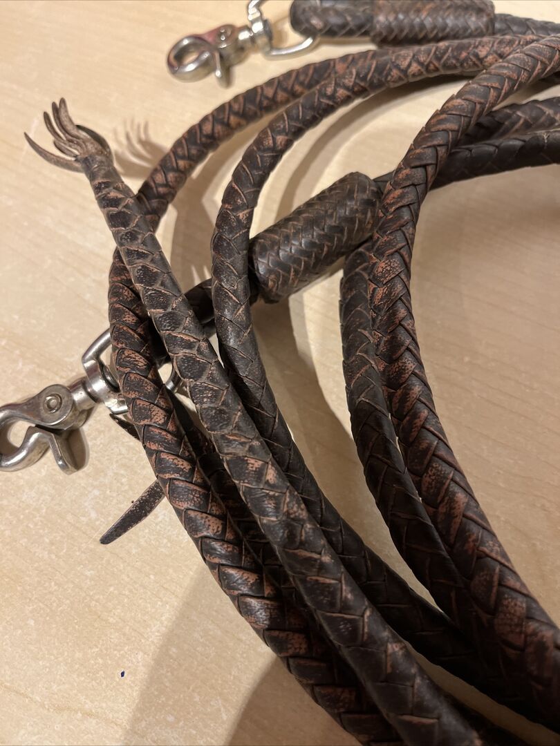 Schöner rundgeflochten Lederzügel Hinten offen , 2,25 m lang mit e Einschnallclip. Farbe braun