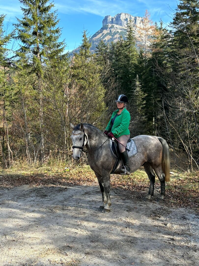 Allegro kennt Ausreiten in der Gruppe und Alleine da ist er aber trotz intensivem Training sehr temperamentvoll (vor allem heimwärts) Zu Zweit Ausreiten ist am Besten