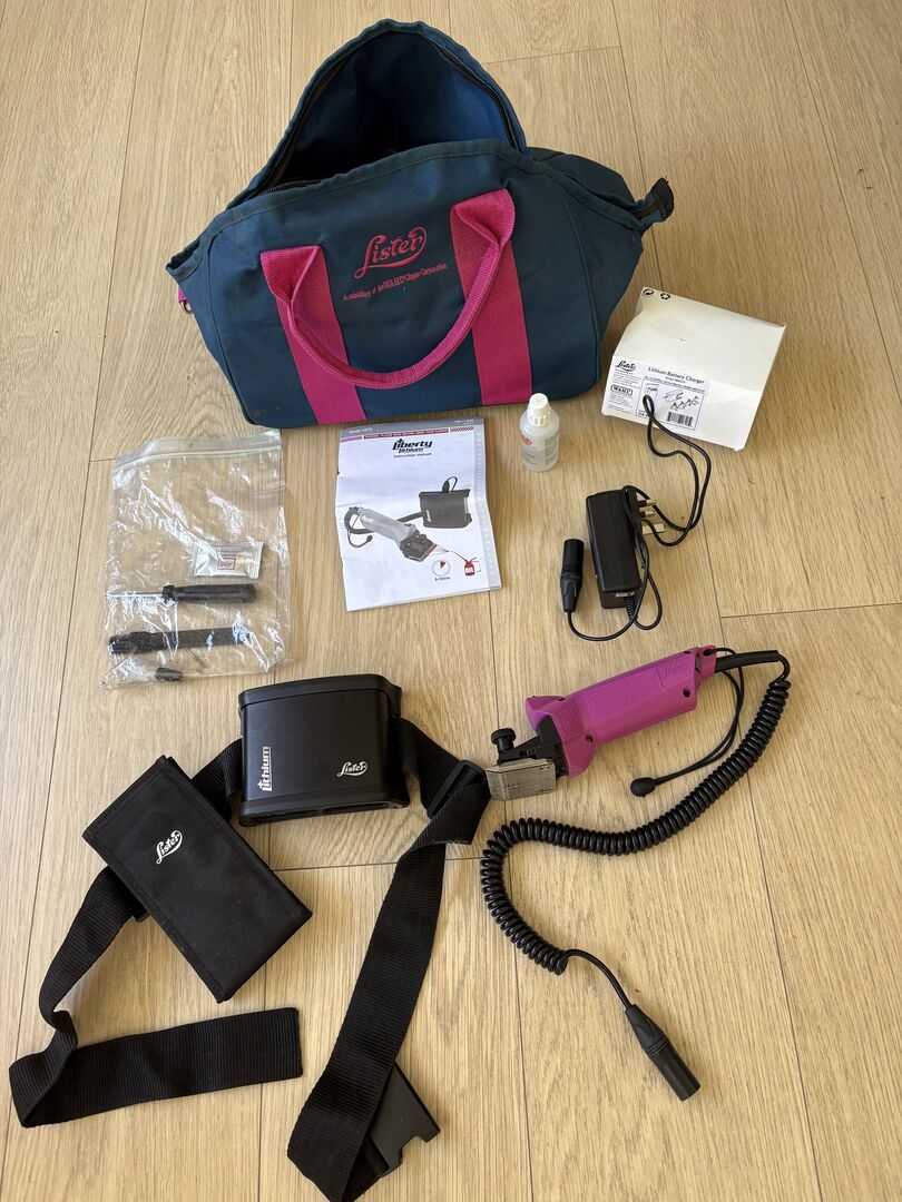Sehr guter Zustand Pferd Schermaschinen mit Lithium-Akku-Ladegerät, Powerbank und Gürtel. Auch kommt mit R15 Öl, eine Reinigungsbürste, R2 Fett und einen Schraubendreher. Alle ordentlich in einem Lister Tasche verpackt, Bedienungsanleitung enthalten als auch.