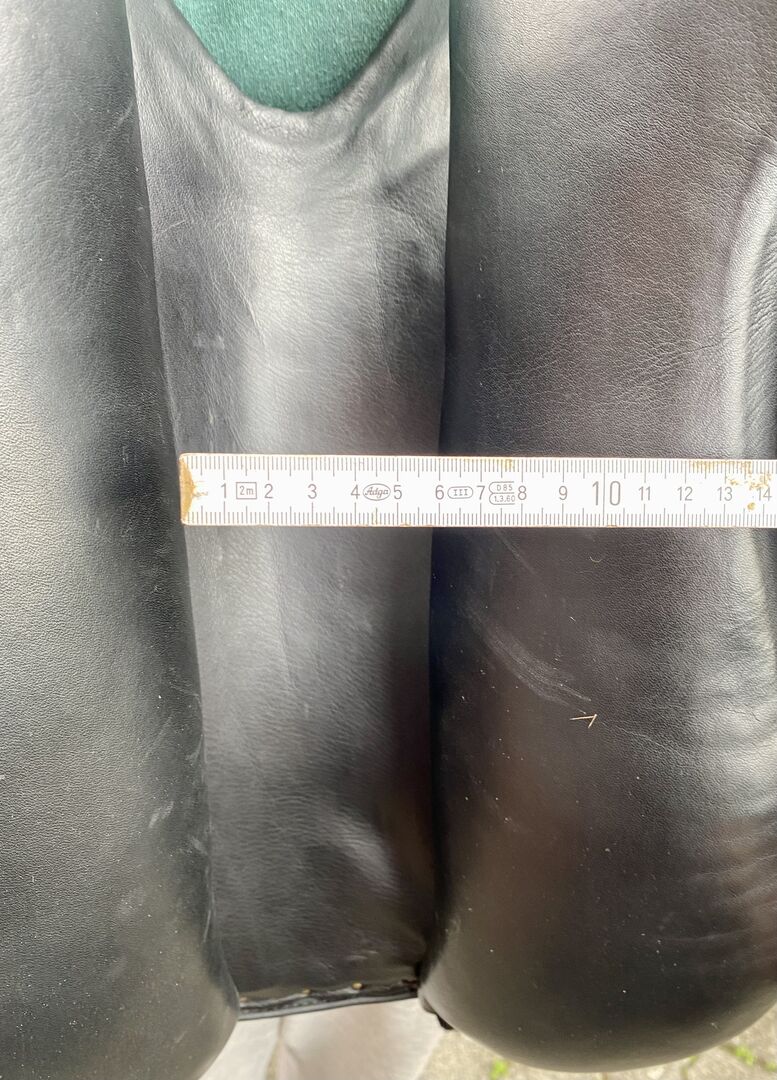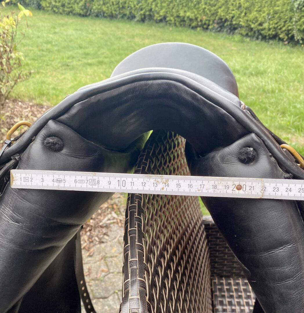 Die Sitzgrösse ist 17.5 und er hat eine mittlere Kammer mit viel WS Freiheit. Er lag auf einem schweren Warmblut mit viel Widerrist.