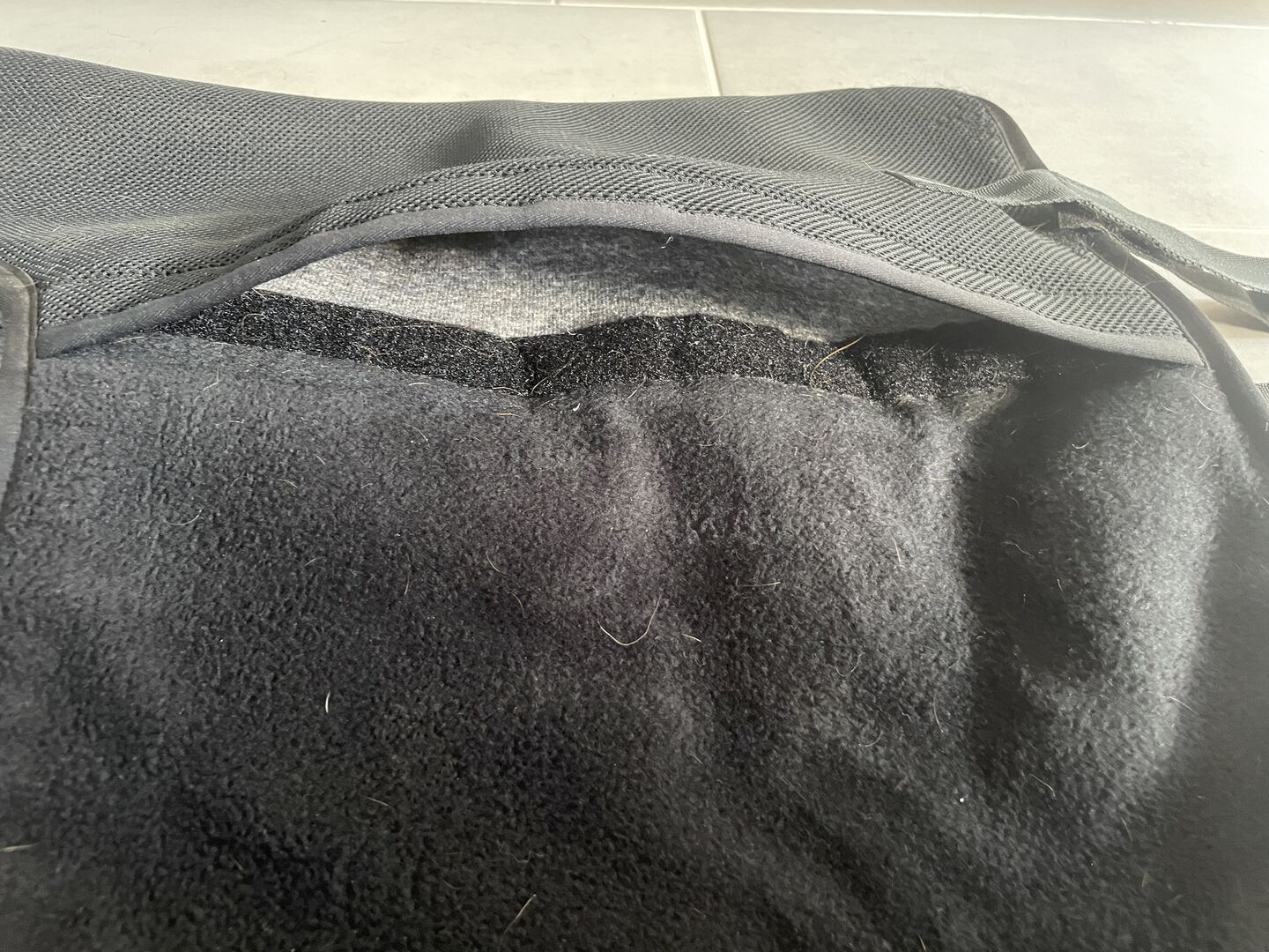 Auf der einen Seite ist das Material leicht aufgeraut durch die Klettverschlüsse, aber keine Löcher oder Risse vorhanden.