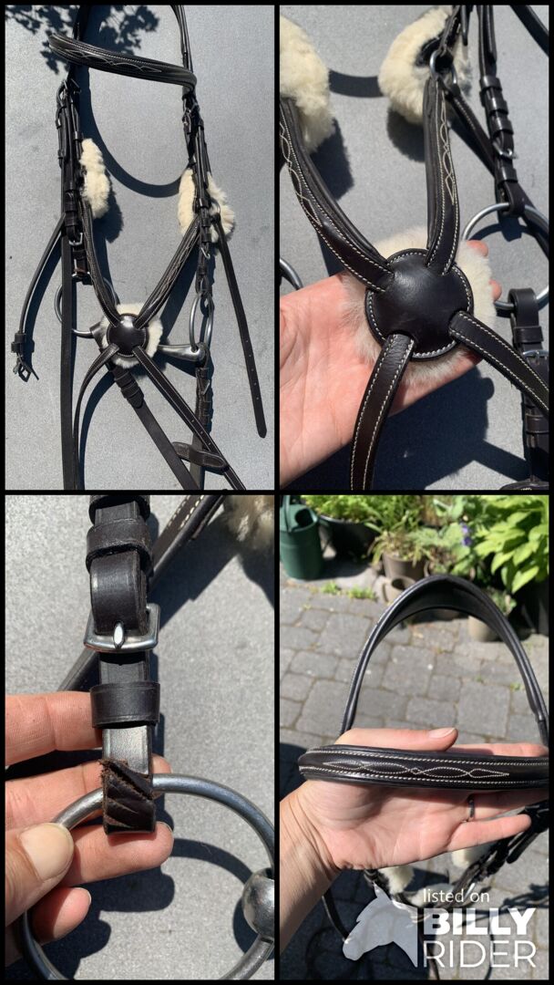 Die Trense wurde nur ca. dreimal benutzt. Ein Backenstück ist eingerissen, daher lege ich ein neues dazu, das allerdings schwarz ist.