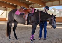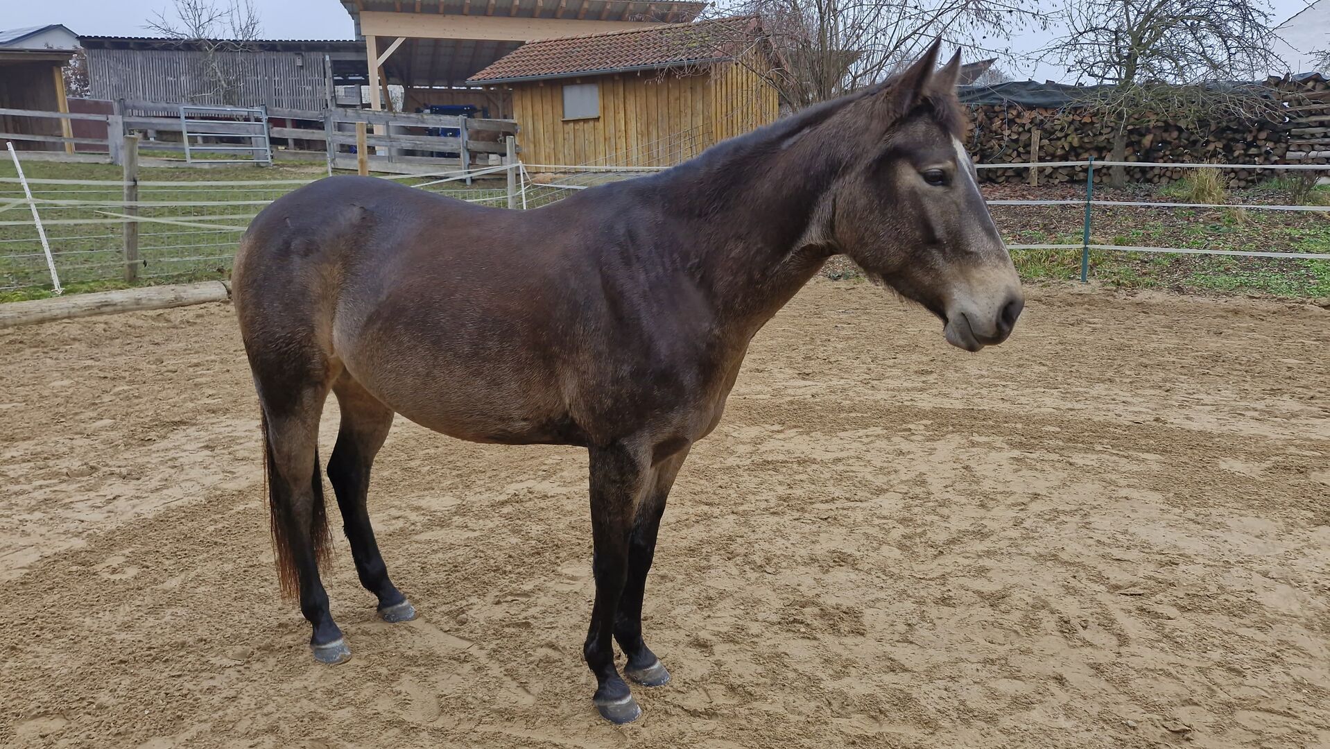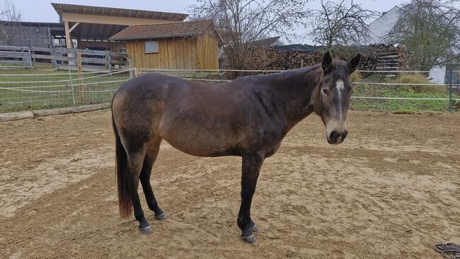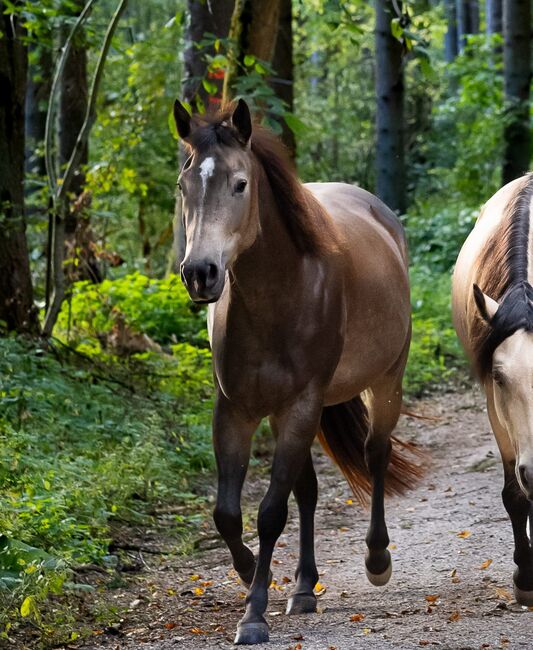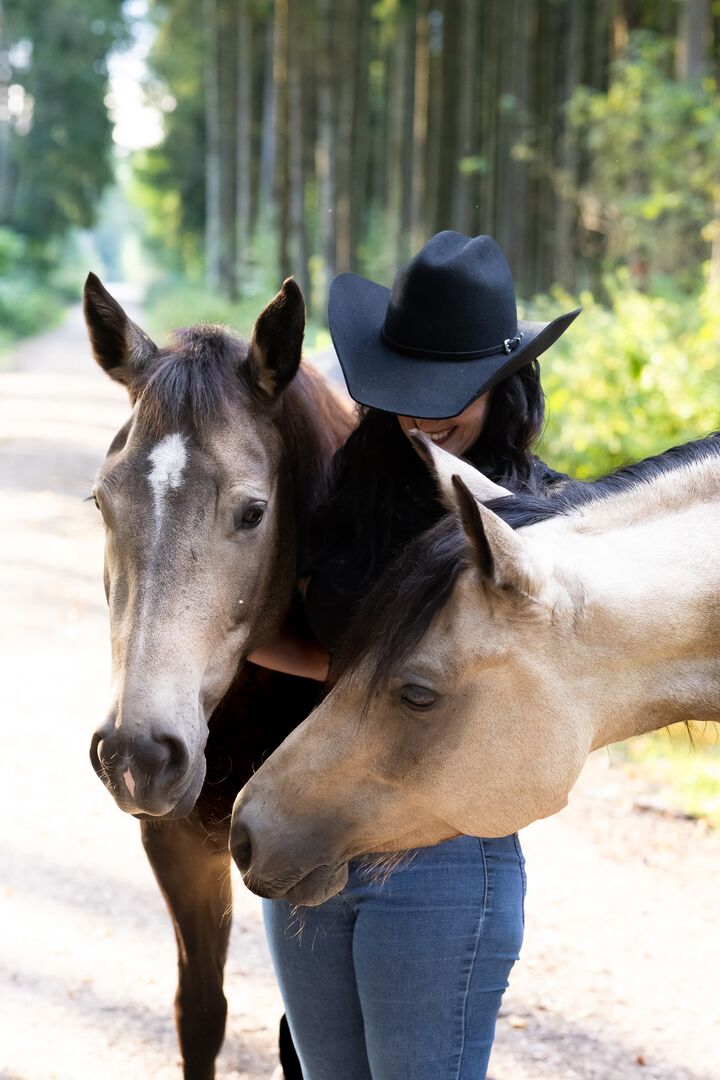 Miss Sinny Bar - eine im Juni 2021 geborene buckskinfarbene Quarter Horse Stute mit einem Stockmaß von etwa 150 cm. Sie ist elegant, sportlich gebaut und gehört nicht zu den Gewichtsträgern, überzeugt aber durch ihre harmonische Entwicklung und ihre natürliche Athletik. Trotz eines angebrochenen Dornfortsatzes im Alter von zwei Jahren, der laut Tierarzt vollständig ausgeheilt ist, ist sie heute gesund, voll belastbar und wird regelmäßig geritten. Gerne kann der Tierarzt dazu befragt werden. Sie ist 5-Panel n/n über die Eltern, regelmäßig geimpft, entwurmt und zahnärztlich kontrolliert, läuft barhuf und war stets unter professioneller Sattelkontrolle. Aktuell lebt sie im Offenstall mit 24-Stunden-Heuversorgung und Weidegang und zeigt sich dort ranghoch innerhalb der Herde. Im Umgang ist sie ein sehr liebes, menschenbezogenes und verschmustes Pferd, das gleichzeitig willensstark, neugierig und manchmal etwas ungeduldig ist. Sie möchte immer gefallen, lernt schnell und zeigt viel Eifer sowie Offenheit für neue Aufgaben. Da sie noch viel hinterfragt und eine klare, faire Führung braucht, ist sie kein Anfängerpferd. Miss Sinny Bar wurde schonend und vielseitig nach dem Pro-Ride-Konzept ausgebildet. In der Halle läuft sie sicher in Schritt, Trab und Galopp und geht sowohl alleine als auch in der Gruppe zuverlässig ins Gelände. Besonders in der Freiarbeit sowie in der Boden- und Longenarbeit zeigt sie großes Talent. Durch ihre sehr gute Reining-Abstammung (Einsteins Revolution x Bueno Swiss Doc) ist sie nicht nur als Nachwuchspferd für ambitionierte Freizeitreiter interessant, sondern perspektivisch auch für die Zucht. Der passende Sattel kann auf Wunsch mit erworben werden. Da es sich um keinen Notverkauf handelt, wird großer Wert auf ein geeignetes Zuhause gelegt, in dem diese talentierte Stute weiter gefördert und abwechslungsreich beschäftigt wird. Miss Sinny Bar bringt alles mit, was man sich von einem jungen, motivierten Pferd wünscht, das gemeinsam mit seinem Menschen wachsen möchte.