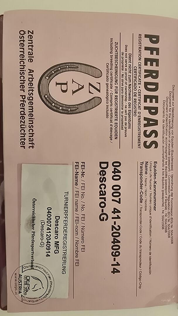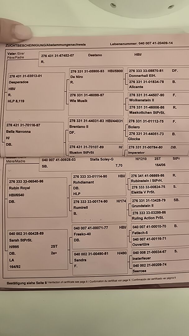 Er verfügt über eine hochwertige Abstammung und überzeugt durch seine Erscheinung, Ausstrahlung und Präsenz. In den letzten vier Monaten wurde er aufgrund von Zeitmangel nur wenig trainiert, ist jedoch grundsätzlich gut geritten und kennt die Arbeit unter dem Sattel.