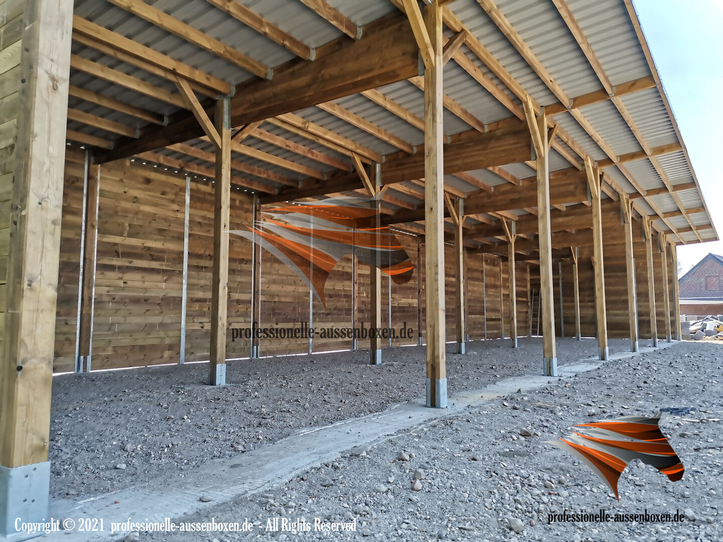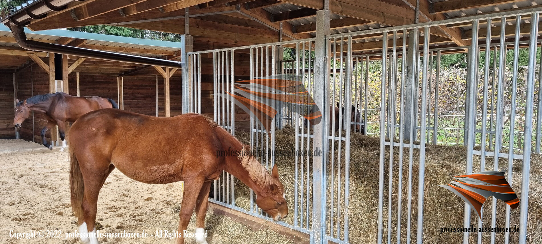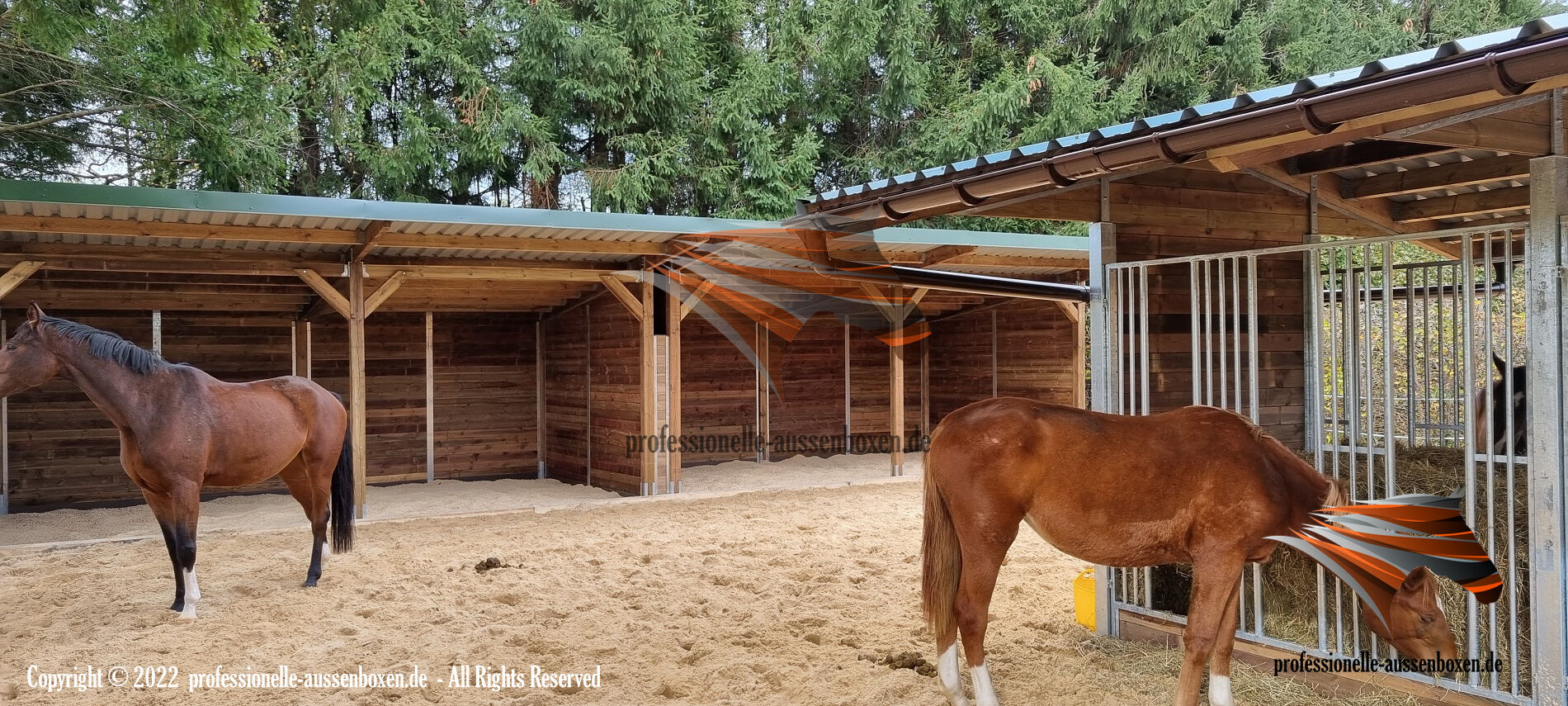 AUSSENBOXEN bietet hochwertige Unterstände und Überdachungen für Pferde, ideal für Weiden, Paddocks und Fütterungsbereiche.