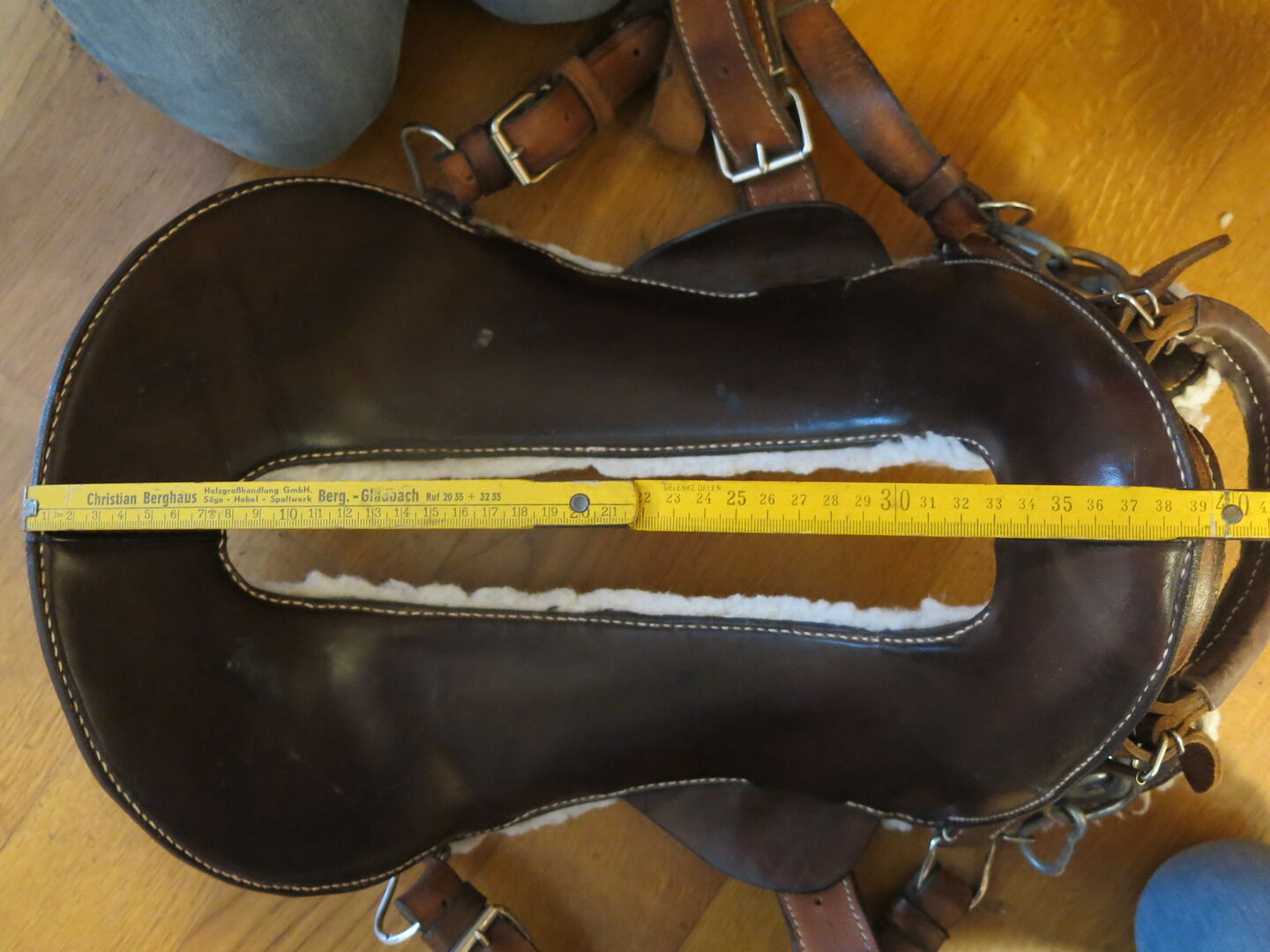 Er ist lederbezogen und ist aufgrund seiner Bauweise (in der Sitzfläche ist ein "Loch") leicht, bequem und doch ausgesprochen stabil. Er dient sowohl als Pack- als auch als Reitsattel. Maße: siehe Fotos.