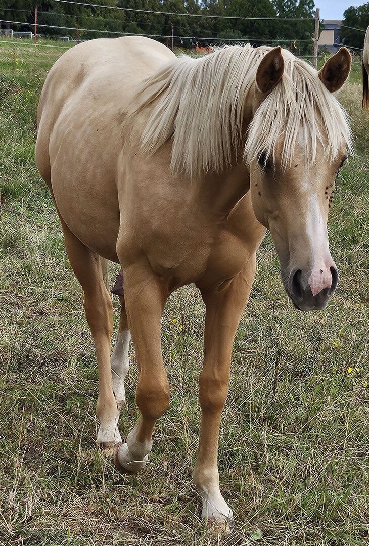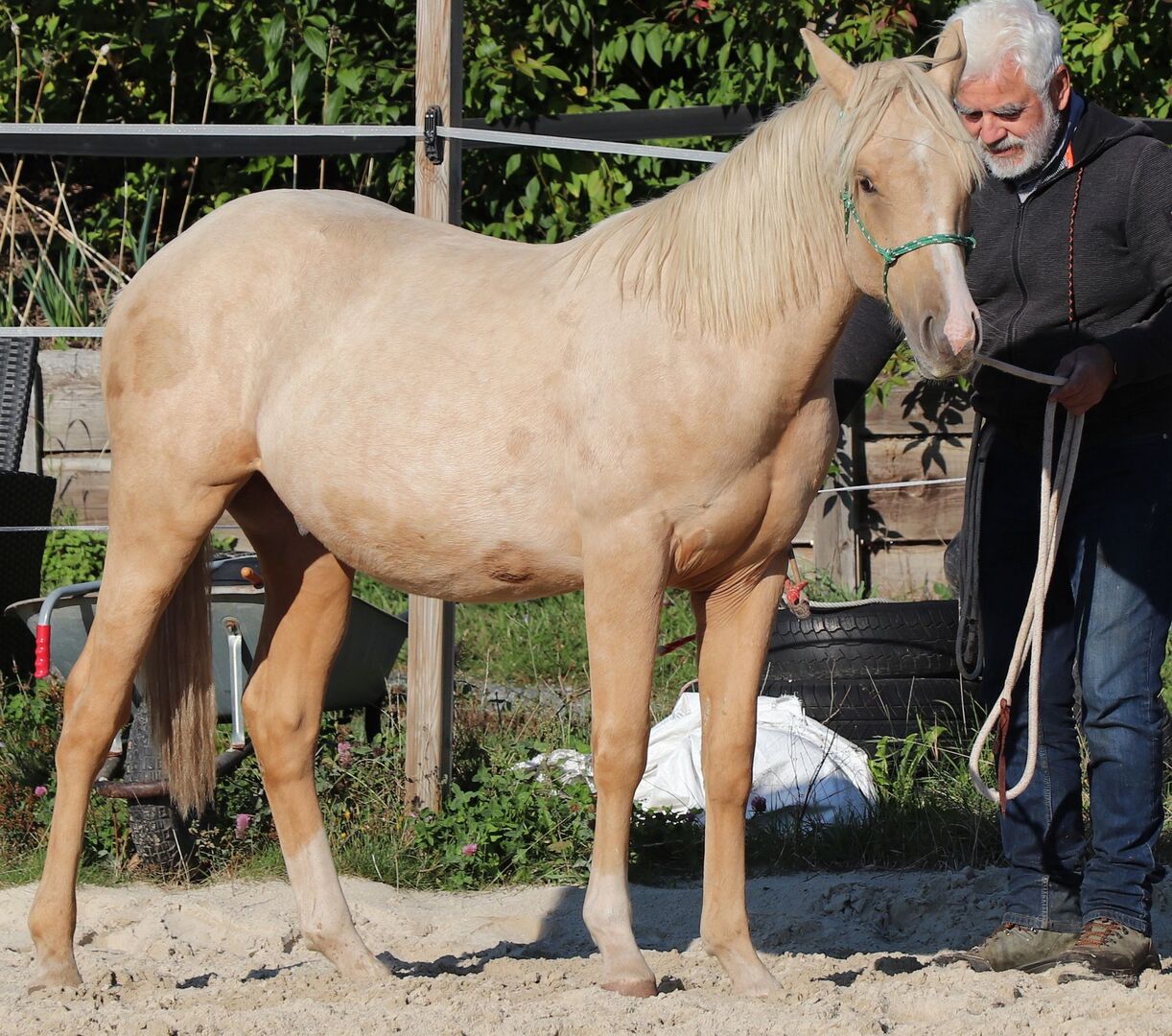 Peppy Doc King Maxen - Dieser 2024 geborene Palomino (Endmaß ca. 148 cm) mit traumhafter weißer Mähne und Schweif ist ein absoluter Eyecatcher - kompakt, korrekt gebaut und mit vielversprechenden Proportionen. Ein Nachwuchspferd, das nicht nur durch seine Optik, sondern auch durch seinen tollen Charakter überzeugt. Er ist menschenbezogen, freundlich, aufmerksam und lernwillig. Im täglichen Umgang zeigt er sich artig, entspannt und unkompliziert. Herausforderungen begegnet er mit Mut und Neugier und lernt schnell. Schon jetzt lässt er sich problemlos verladen und geht ruhig und gelassen an der Hand ins Gelände. Der Hengst wächst gesund und robust im Offenstall in gemischter Herde auf und wird liebevoll und mit viel Sachverstand an seine Aufgaben als Reitpferd herangeführt - nach den Prinzipien des Natural Horsemanship, Schritt für Schritt und ohne Zeitdruck. Die Farbgenetik (e/e, A/a, CH/ch) macht ihn nicht nur farblich besonders interessant, sondern eröffnet auch züchterisch Potenzial. Peppy ist altersgemäß geimpft und regelmäßig entwurmt. Seine Abstammung lässt keine Wünsche offen: Top Cuttinglinien (Enkel von Peptoboonmal) väterlicherseits treffen auf ausgezeichnete Reiteigenschaften mütterlicherseits - eine ideale Kombination für Sport, Turnier und Freizeit. Der Hengst ist DQHA sowie Regional-Futurity startberechtigt und bringt alles mit, um in Zukunft ein vielseitig einsetzbares Reitpferd mit Charme, Talent und Herz zu werden.