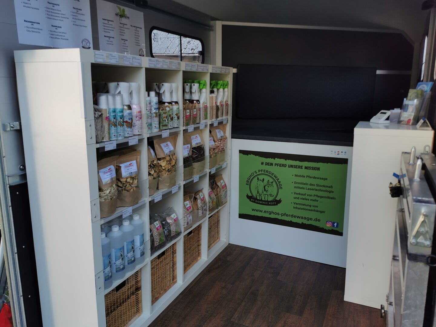 Während deines Wiegetermins kannst du bei uns im mobilen Laden shoppen. Neben Pflegeprodukten von Bense&Eicke und Soulhorse, haben wir auch NordseeTrockengemüse. Natürlich dürfen Halfter, Stricke und Co auch nicht fehlen. 🤩