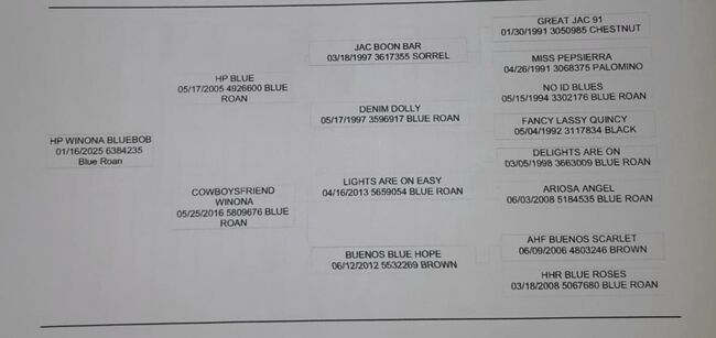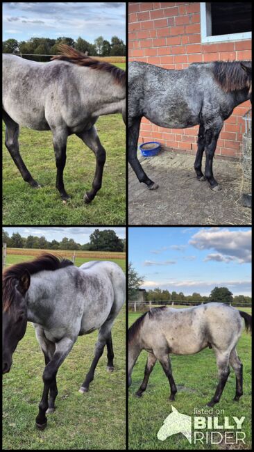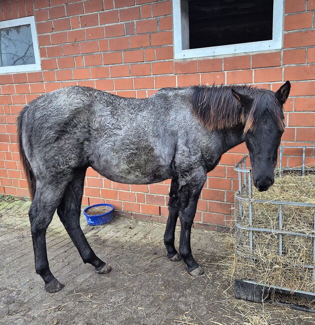 Blue Roan, homozygot Roan 5 Panel und IMM/MYH: N/N Foundation: 94% FQHA Sire: HP Blue Dam : Cowboysfriend Winona