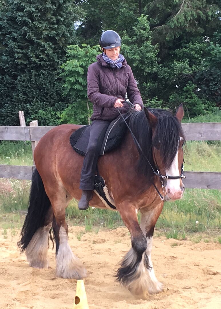 Marlowe hat eine Basisausbildung in der akademischen Bodenarbeit, also Seitengänge im Schritt und Basis-Longenarbeit am Cavečon in allen Grundgangarten. Geritten wurde er vierzügelig mit der 3 zu 1 -Zügelführung.. Vom Sattel aus sind die Seitengänge noch ausbaufähig, und er ist vom Boden und vom Sattel aus anpiaffiert, was natürlich ebenfalls weiterer Arbeit bedarf. Wir haben ebenfalls Ansätze aus der Bückeburger Hofreitschule in Marlowes Ausbildung mit einfließen lassen, da zuviel Kleinklein und Detailverliebtheit ihn demotivieren. Sehr viel Spaß macht Marlowe die Freiarbeit im Roundpen, wo er unglaublich gut auf Körpersprache reagiert! Wer Freude an Zirkuslektionen hat, findet in Marlowe sicherlich ebenfalls einen aufgeschlossenen Schüler. Als kaltblütiges Pferd benötigt er kurze Arbeitsphasen mit entsprechenden Pausen. Wir haben ihn nie länger als 30 min gearbeitet, wenn eine Einheit sehr gut war, haben wir sie auch früher beendet. Deshalb ist Marlowe immer motiviert und freut sich auf die Zusammenarbeit mit seinem Menschen. Ins Gelände sind wir gelegentlich spazieren gegangen, wo Marlowe sich interessiert, aber entspannt zeigt. Wir können uns ihn bei entsprechender Übung durchaus als gutes Geländepferd vorstellen. Was Marlowe leider gar nicht mag, ist Hängerfahren. Hier geht es nur mit Geduld und einem laaaangen Atem.