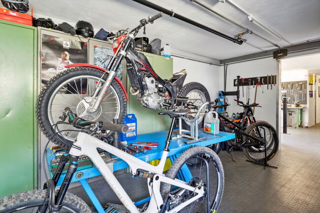 Die Liegenschaft umfasst eine Werkstatt mit mehreren Räumen, welche zurzeit als Motorrad-Werkstatt verwendet wird. Diese hat ausserdem eine eigene Toilette sowie ein Büroabteil und wurde 1995 erbaut. Diese Räumlichkeiten bieten ausreichend Platz für die Lagerung von Materialien oder Maschinen. Die Werkstatt ist funktional gestaltet und ermöglicht eine effiziente Nutzung des verfügbaren Platzes auf 82 m². Zusätzlich bietet die Liegenschaft Ihnen eine Garage. Direkt verbunden hat es einen weiteren Raum, welcher Ihnen als Materiallager dient. Zur Sicherheit trägt das grosse manuelle Eisentor bei der Einfahrt zur Liegenschaft bei. Die Photovoltaik-Anlage auf dem Dach der Werkstatt und dem Wintergarten ist auf 15 kW (Nennleistung) ausgelegt und dient einerseits dem Eigenverbrauch – andererseits wird der Überschuss der Gemeinde verkauft (Einnahmen von ca. CHF 850.-- pro Quartal).