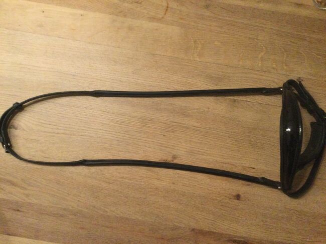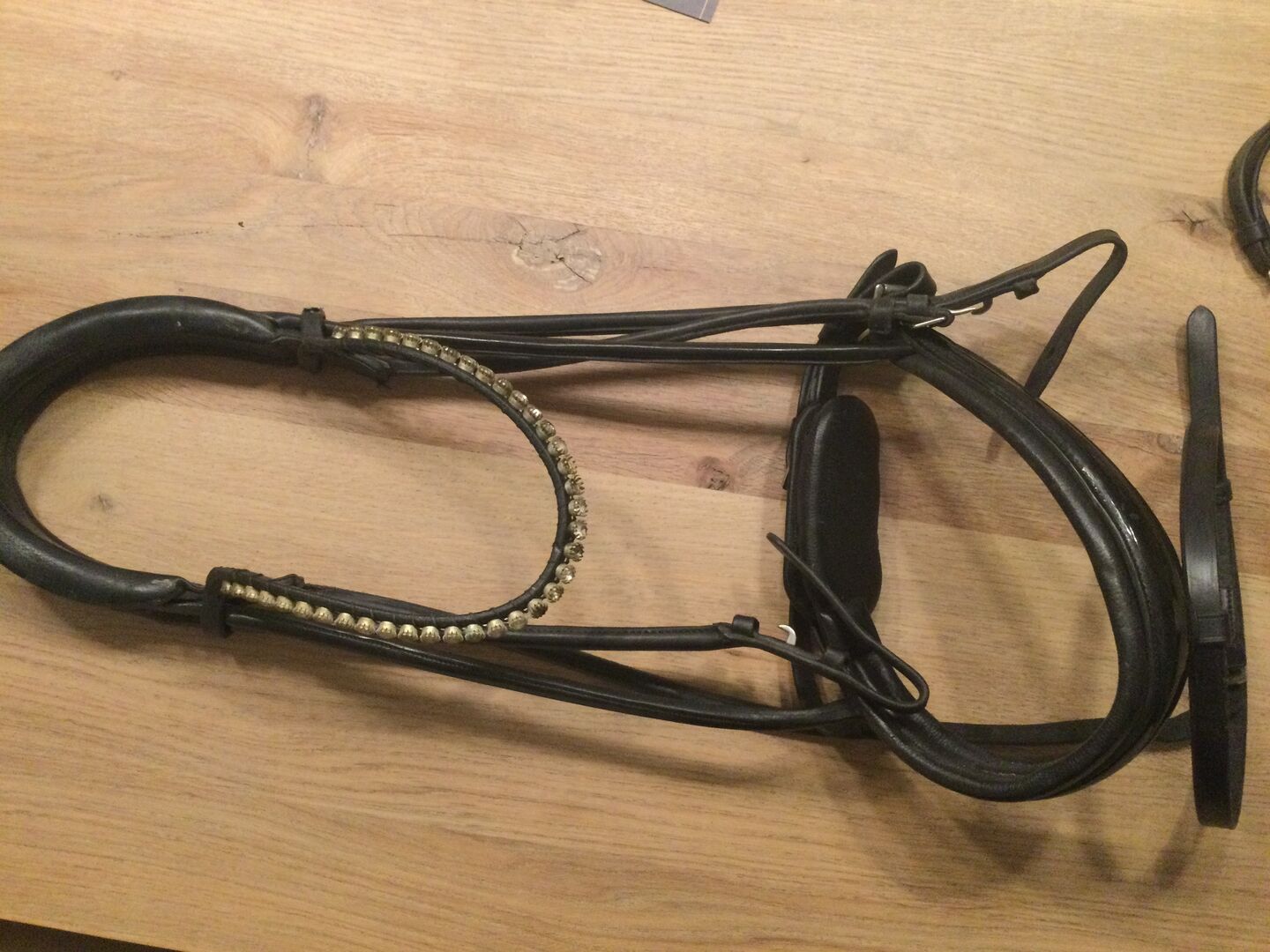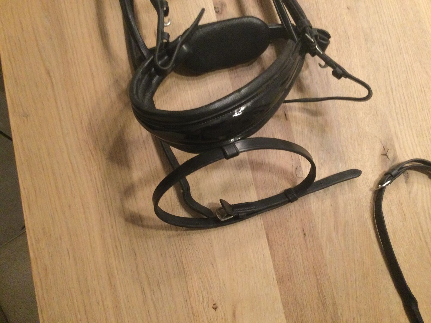 wurde nur für ein Pferd gebraucht. Beide Reithalfter schwarz /Lack, unterlegt und gut gepolstert. Trense mit beiden Reithalftern 270,00€