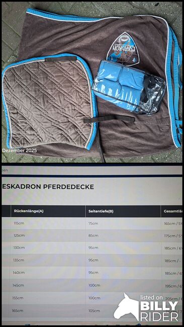 Hier biete ich ein sehr schönes Set von Eskadron für ein Großpferd in einem guten und gepflegten Zustand. Als Zugabe lege ich noch die passenden Bandagen dazu. Größe L 145cm Siehe auch Größentabelle im Bild 2