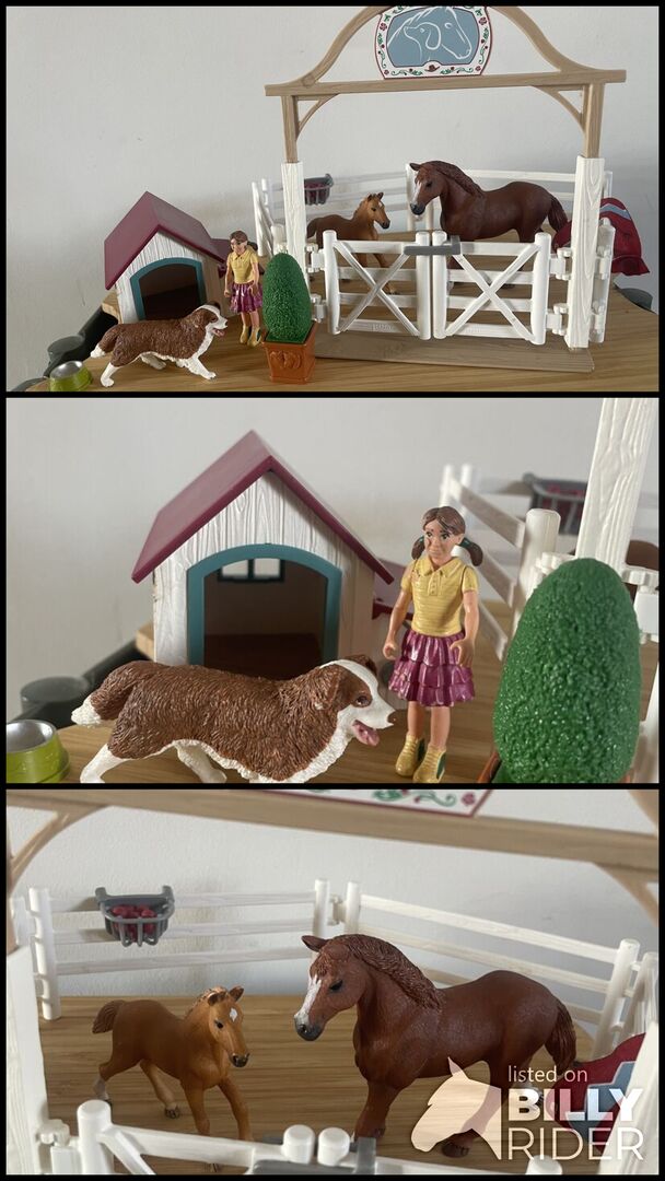 Das Set beinhaltet 2 Pferde inkl. Fohlendecken & Futtertrog, einen Paddock, eine Hundehütte, einen Hund + Napf sowie ein Mädchen.