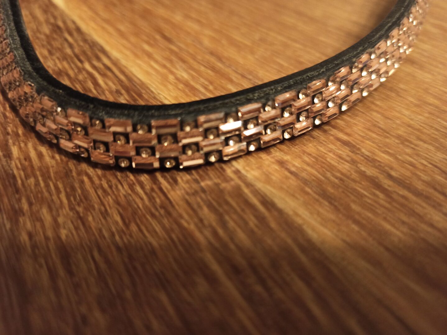 Ein hübscher schwarzer Stirnriemen mit rechteckigen und runden Steinchen in roségold. Habe ihn etwa ein halbes Jahr lang benutzt, aber mein Pferd hat einen Elefantenkopf, deshalb verkaufe ich ihn. Einem normalen Warmblut passt er prima.