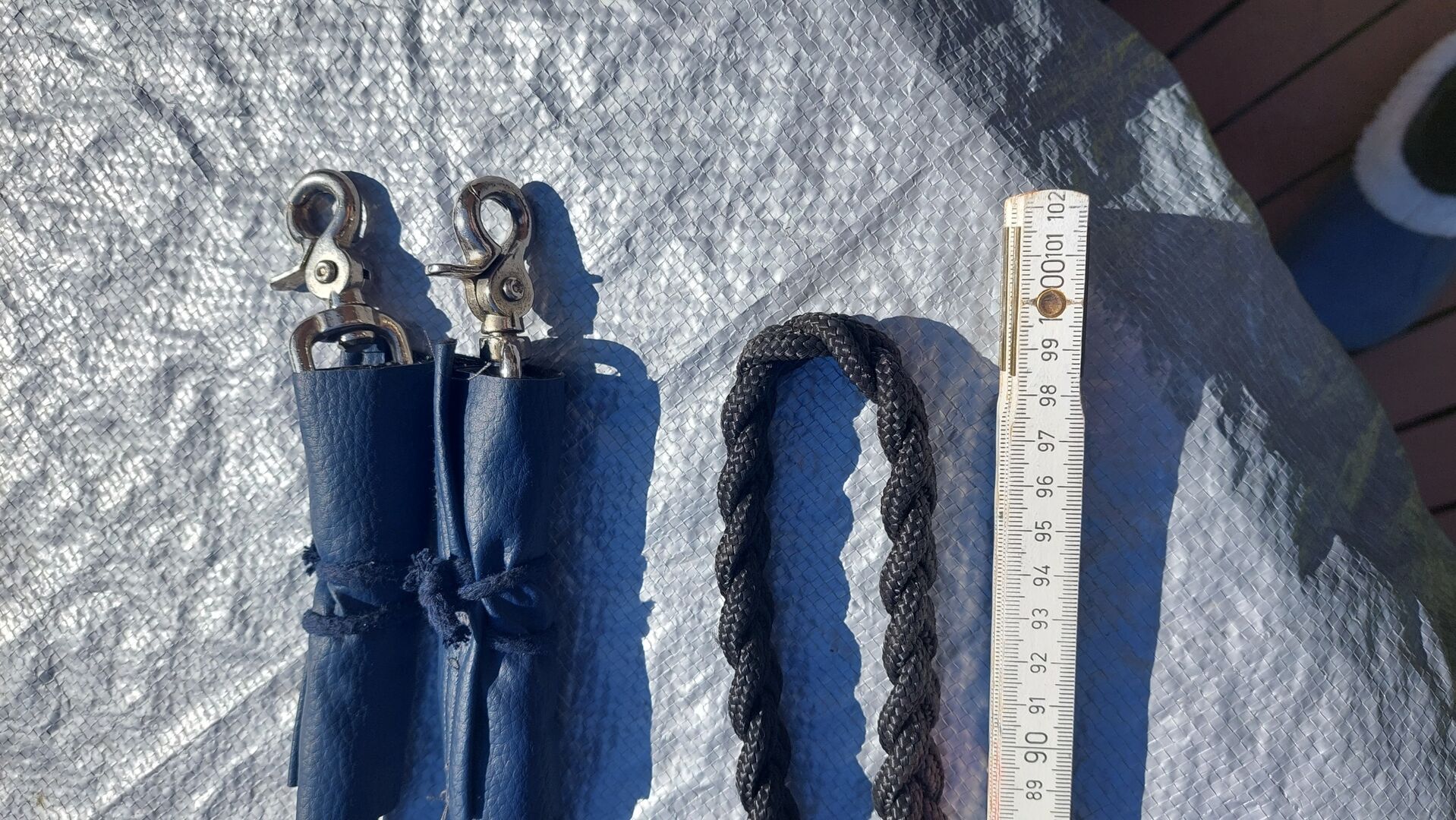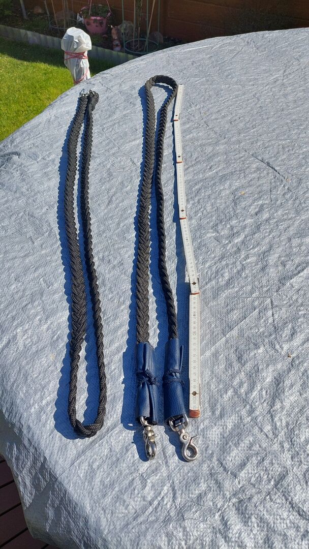 2 x geflochtene Stoffzügel, 1 x mit Snaper, 1 x mit Karabiner. Farbe schwarz. Je 5 Euro VB.