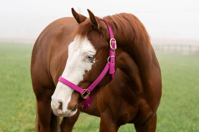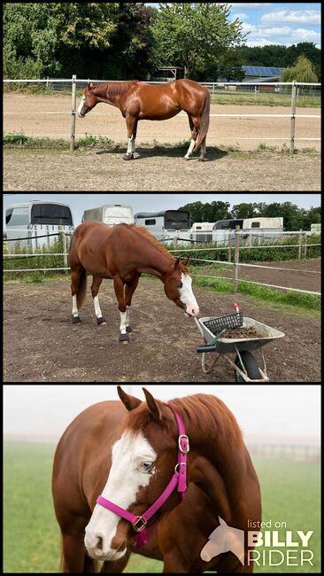 Diese bildhübsche Paint Horse Stute, geboren im Juni 2022, mit einem Stockmaß von ca. 151 cm und in der Farbe Sorrel Tobiano, überzeugt durch einen ausdrucksstarken Kopf, ein korrektes und kräftiges Fundament sowie eine sehr harmonische Gesamterscheinung. Käthe deckt auch größere Reiter gut ab und ist sowohl optisch als auch charakterlich ein echter Hingucker. Die Stute ist gesund, Röntgenbilder von Hufrolle und Sprunggelenken liegen ohne Befund vor, PSSM1 n/p, hat aber keinerlei Symptome und man merkt ihr nichts an. Sie wurde regelmäßig physiotherapeutisch und chiropraktisch durchgecheckt, die Zähne wurden alle halbe Jahre kontrolliert, sie ist regelmäßig geimpft und entwurmt sowie schmiede- und verladefromm. Sie kennt 24/7 Heufütterung, steht nachts in der Box und ist sowohl Boxen- als auch Herdenhaltung gewohnt, dabei sehr gut sozialisiert. Charakterlich ist sie sehr menschenbezogen, verschmust, neugierig, ausgeglichen und unkompliziert. Im Umgang ist sie super brav, möchte ihrem Reiter immer gefallen und gibt im Training stets 100 %. Unter dem Sattel zeigt sie sich sehr talentiert, lernwillig, super rittig, ausbalanciert und bereits gut gefestigt, zudem ist sie super weich zu sitzen. Käthe besitzt eine gute Westerngrundausbildung, dreht und macht sehr gut mit bei der Bodenarbeit. Sie lässt sich auch brav von einem neunjährigen Kind reiten, dennoch ist sie aufgrund ihres jungen Alters und des frühen Ausbildungsstandes kein reines Anfängerpferd. Durch ihre sehr gute Reining-Abstammung ist sie sowohl für ambitionierte Freizeitreiter als auch für den späteren Sporteinsatz interessant und eignet sich ideal für Reiter, die Sport und Freizeit miteinander verbinden möchten. Eine junge Stute mit tollem Charakter und viel Potenzial für ihre weitere Ausbildung.