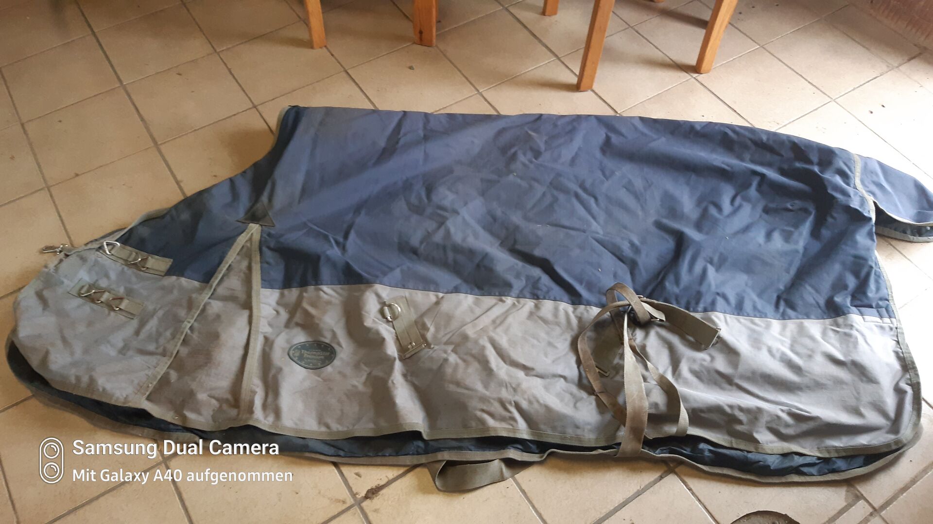 Gern genutzte Paddockdecke mit Kreuzgurten und Beinschnüren, 155 cm.