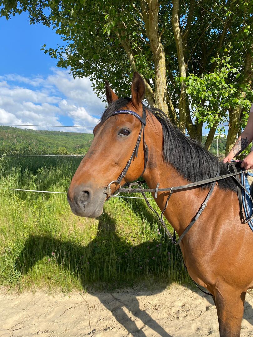 Er war auf der Rennbahn ist aber absolut klar im Kopf und hat keine Unarten wie Buckeln, steigen etc. Er macht auch keinen Quatsch wenn er mal ein paar Tage steht. Er ist reiterlich nur Freizeitgeritten aber sehr lernwillig und versucht immer alles richtig zumachen. Verkauft wird er nur weil ich komplett aufgrund von Zeitmangel aufhöre. Sein Equipment kann gg Aufpreis mit erworben werden