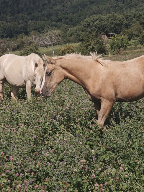 Shining Gun Tari ist eine bildhübsche Quarter Horse Stute, geboren am 04.03.2025, in der Farbe Palomino, mit einem Endmaß von ca. 153 cm. Die AQHA-Papiere liegen vor und genetisch ist sie 5-Panel n/n über die Eltern. Die junge Stute überzeugt durch ein korrektes Gebäude, ein sehr gutes Fundament sowie eine ausgewogene Bemuskelung. Sie ist gesund, geimpft, entwurmt und bestens gepflegt. Aufgewachsen in der Herde und im Offenstall, kennt sie den Umgang mit Tierarzt und Hufschmied und ist halfterführig. Shining Gun Tari bringt einen lieben, neugierigen und menschenbezogenen Charakter mit und zeigt fohlentypisch verspielt ein gelehriges und aufgeschlossenes Temperament. Erste Jungpferde-Disziplin wäre jetzt ideal, um sie weiter zu fördern. Dank ihrer guten Reining-Abstammung (Colonels Smoking Gun, Shining Spark, Frozen Sailor) kann sie später vielseitig eingesetzt werden, sei es als Showpferd oder als Freizeitpartner. Sie wächst unter besten Bedingungen und viel Liebe auf und wird direkt vom Züchter in allerbeste Hände abgegeben.